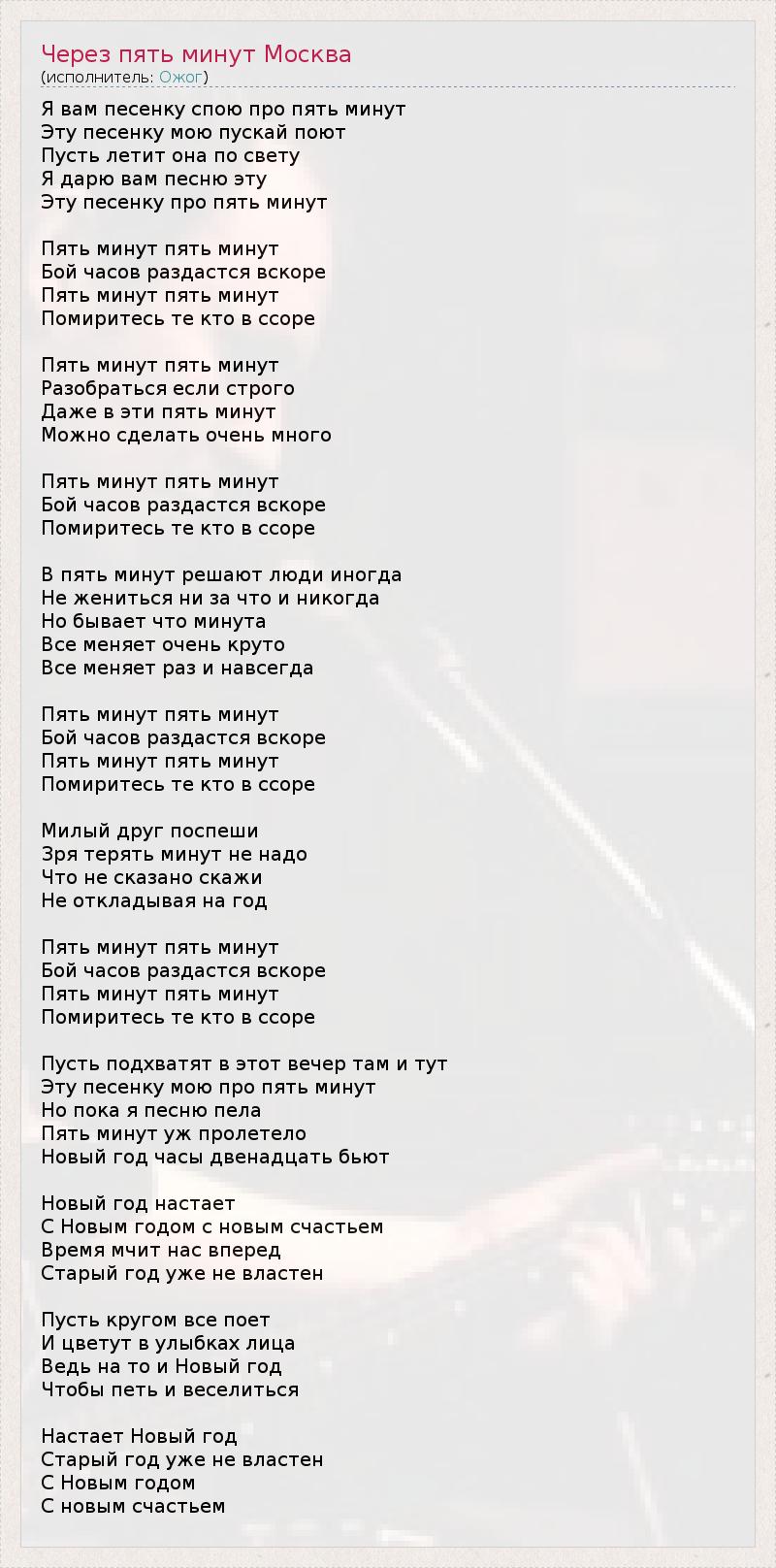 Я вам песенку спою про пять минут Эту песенку мою пускай поют Пусть летит она по свету Я дарю вам песню эту Эту песенку про пять минут Пять минут пять минут Бой часов раздастся вскоре Пять минут пять минут Помиритесь те кто в ссоре Пять минут пять минут Разобраться если строго Даже в эти пять минут Можно сделать очень много Пять минут пять минут Бой часов раздастся вскоре Помиритесь те кто в ссоре В пять минут решают люди иногда Не жениться ни за что и никогда Но бывает что минута Все меняет очень круто Все меняет раз и навсегда Пять минут пять минут Бой часов раздастся вскоре Пять минут пять минут Помиритесь те кто в ссоре Милый друг поспеши Зря терять минут не надо Что не сказано скажи Не откладывая на год Пять минут пять минут Бой часов раздастся вскоре Пять минут пять минут Помиритесь те кто в ссоре Пусть подхватят в этот вечер там и тут Эту песенку мою про пять минут Но пока я песню пела Пять минут уж пролетело Новый год часы двенадцать бьют Новый год настает С Новым годом с новым счастьем Время мчит нас вперед Старый год уже не властен Пусть кругом все поет И цветут в улыбках лица Ведь на то и Новый год Чтобы петь и веселиться Настает Новый год Старый год уже не властен С Новым годом С новым счастьем