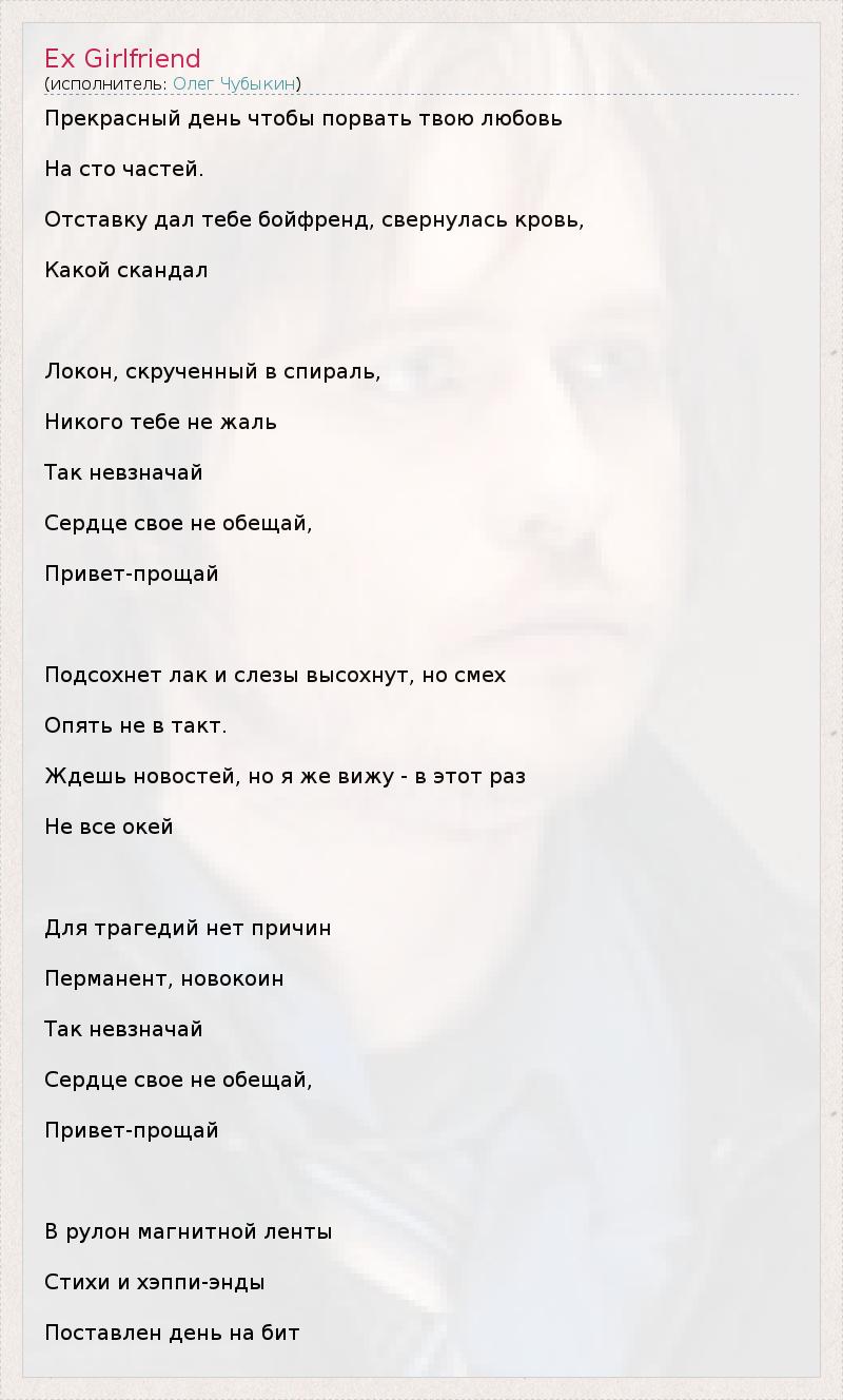 Прекрасный день чтобы порвать твою любовь На сто частей. Отставку дал тебе бойфренд, свернулась кровь, Какой скандал Локон, скрученный в спираль, Никого тебе не жаль Так невзначай Сердце свое не обещай, Привет-прощай Подсохнет лак и слезы высохнут, но смех Опять не в такт. Ждешь новостей, но я же вижу - в этот раз Не все окей Для трагедий нет причин Перманент, новокоин Так невзначай Сердце свое не обещай, Привет-прощай В рулон магнитной ленты Стихи и хэппи-энды Поставлен день на бит
