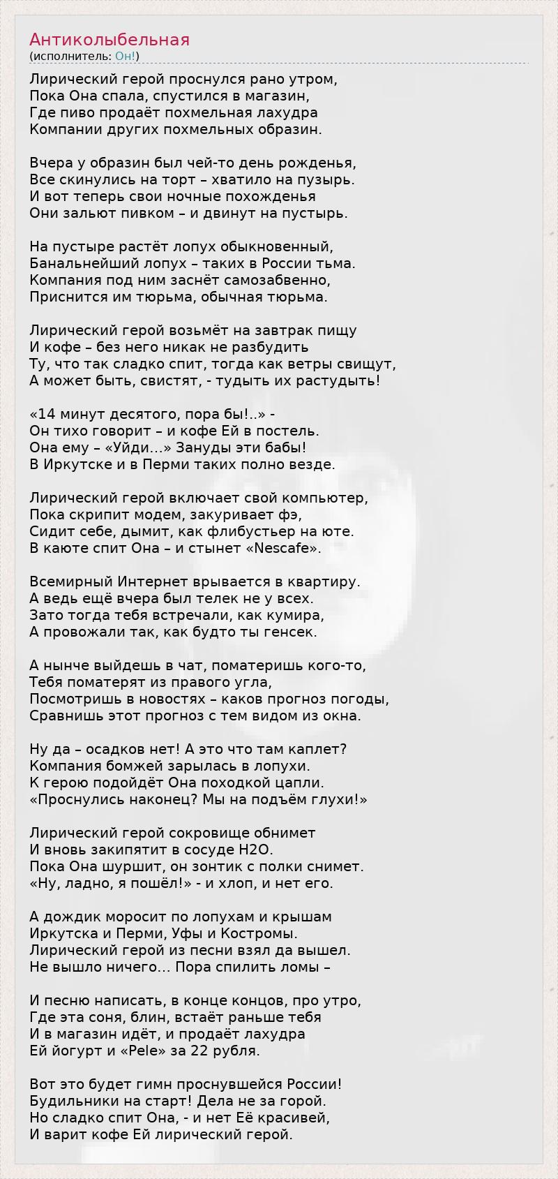 Лирический герой проснулся рано утром, Пока Она спала, спустился в магазин, Где пиво продаёт похмельная лахудра Компании других похмельных образин. Вчера у образин был чей-то день рожденья, Все скинулись на торт – хватило на пузырь. И вот теперь свои ночные похожденья Они зальют пивком – и двинут на пустырь. На пустыре растёт лопух обыкновенный, Банальнейший лопух – таких в России тьма. Компания под ним заснёт самозабвенно, Приснится им тюрьма, обычная тюрьма. Лирический герой возьмёт на завтрак пищу И кофе – без него никак не разбудить Ту, что так сладко спит, тогда как ветры свищут, А может быть, свистят, - тудыть их растудыть! «14 минут десятого, пора бы!..» - Он тихо говорит – и кофе Ей в постель. Она ему – «Уйди…» Зануды эти бабы! В Иркутске и в Перми таких полно везде. Лирический герой включает свой компьютер, Пока скрипит модем, закуривает фэ, Сидит себе, дымит, как флибустьер на юте. В каюте спит Она – и стынет «Nescafe». Всемирный Интернет врывается в квартиру. А ведь ещё вчера был телек не у всех. Зато тогда тебя встречали, как кумира, А провожали так, как будто ты генсек. А нынче выйдешь в чат, поматеришь кого-то, Тебя поматерят из правого угла, Посмотришь в новостях – каков прогноз погоды, Сравнишь этот прогноз с тем видом из окна. Ну да – осадков нет! А это что там каплет? Компания бомжей зарылась в лопухи. К герою подойдёт Она походкой цапли. «Проснулись наконец? Мы на подъём глухи!» Лирический герой сокровище обнимет И вновь закипятит в сосуде H2O. Пока Она шуршит, он зонтик с полки снимет. «Ну, ладно, я пошёл!» - и хлоп, и нет его. А дождик моросит по лопухам и крышам Иркутска и Перми, Уфы и Костромы. Лирический герой из песни взял да вышел. Не вышло ничего… Пора спилить ломы – И песню написать, в конце концов, про утро, Где эта соня, блин, встаёт раньше тебя И в магазин идёт, и продаёт лахудра Ей йогурт и «Pele» за 22 рубля. Вот это будет гимн проснувшейся России! Будильники на старт! Дела не за горой. Но сладко спит Она, - и нет Её красивей, И варит кофе Ей лирический герой.