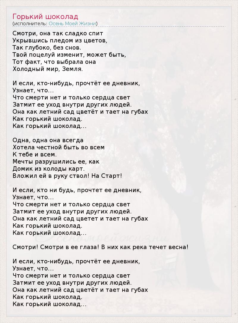 Смотри, она так сладко спит Укрывшись пледом из цветов, Так глубоко, без снов. Твой поцелуй изменит, может быть, Тот факт, что выбрала она Холодный мир, Земля. И если, кто-нибудь, прочтёт ее дневник, Узнает, что… Что смерти нет и только сердца свет Затмит ее уход внутри других людей. Она как летний сад цветёт и тает на губах Как горький шоколад. Как горький шоколад… Одна, одна она всегда Хотела честной быть во всем К тебе и всем. Мечты разрушились ее, как Домик из колоды карт. Вложил ей в руку ствол! На Старт! И если, кто ни будь, прочтет ее дневник, Узнает, что… Что смерти нет и только сердца свет Затмит ее уход внутри других людей. Она как летний сад цветет и тает на губах Как горький шоколад. Как горький шоколад… Смотри! Смотри в ее глаза! В них как река течет весна! И если, кто-нибудь, прочтёт ее дневник, Узнает, что… Что смерти нет и только сердца свет Затмит ее уход внутри других людей. Она как летний сад цветёт и тает на губах Как горький шоколад. Как горький шоколад…