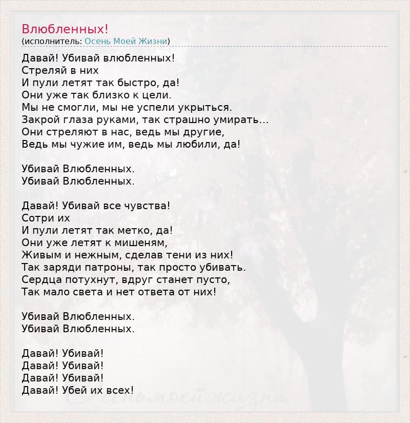 Давай! Убивай влюбленных! Стреляй в них И пули летят так быстро, да! Они уже так близко к цели. Мы не смогли, мы не успели укрыться. Закрой глаза руками, так страшно умирать… Они стреляют в нас, ведь мы другие, Ведь мы чужие им, ведь мы любили, да! Убивай Влюбленных. Убивай Влюбленных. Давай! Убивай все чувства! Сотри их И пули летят так метко, да! Они уже летят к мишеням, Живым и нежным, сделав тени из них! Так заряди патроны, так просто убивать. Сердца потухнут, вдруг станет пусто, Так мало света и нет ответа от них! Убивай Влюбленных. Убивай Влюбленных. Давай! Убивай! Давай! Убивай! Давай! Убивай! Давай! Убей их всех!
