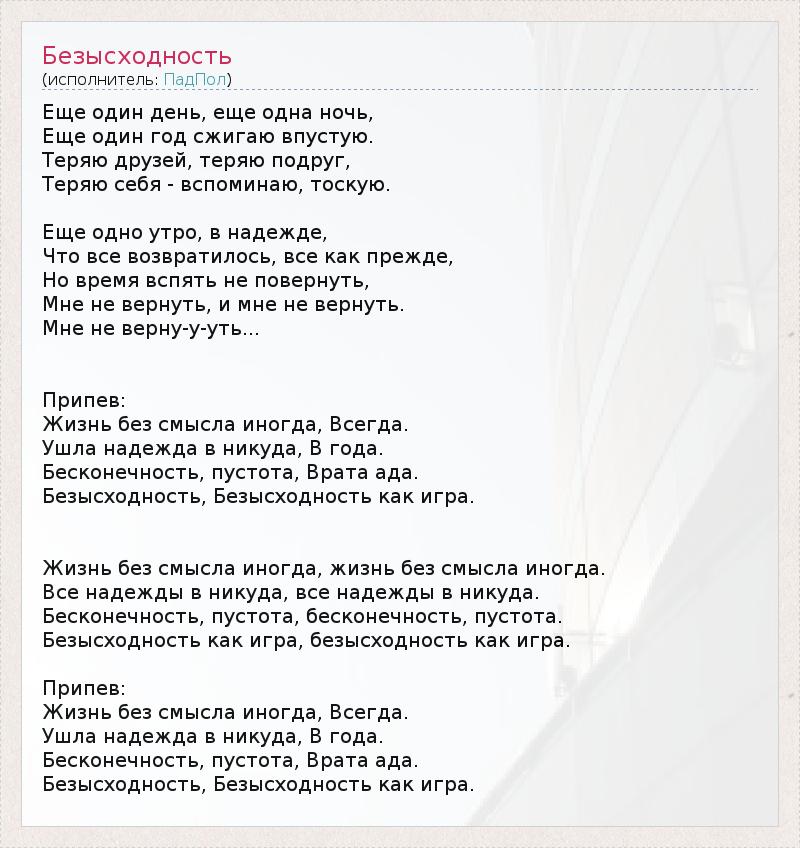 Еще один день, еще одна ночь, Еще один год сжигаю впустую. Теряю друзей, теряю подруг, Теряю себя - вспоминаю, тоскую. Еще одно утро, в надежде, Что все возвратилось, все как прежде, Но время вспять не повернуть, Мне не вернуть, и мне не вернуть. Мне не верну-у-уть... Припев: Жизнь без смысла иногда, Всегда. Ушла надежда в никуда, В года. Бесконечность, пустота, Врата ада. Безысходность, Безысходность как игра. Жизнь без смысла иногда, жизнь без смысла иногда. Все надежды в никуда, все надежды в никуда. Бесконечность, пустота, бесконечность, пустота. Безысходность как игра, безысходность как игра. Припев: Жизнь без смысла иногда, Всегда. Ушла надежда в никуда, В года. Бесконечность, пустота, Врата ада. Безысходность, Безысходность как игра.