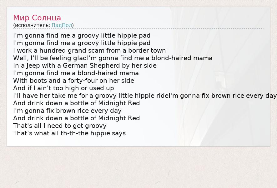 I'll have her take me for a groovy little hippie rideI'm gonna fix brown rice every day