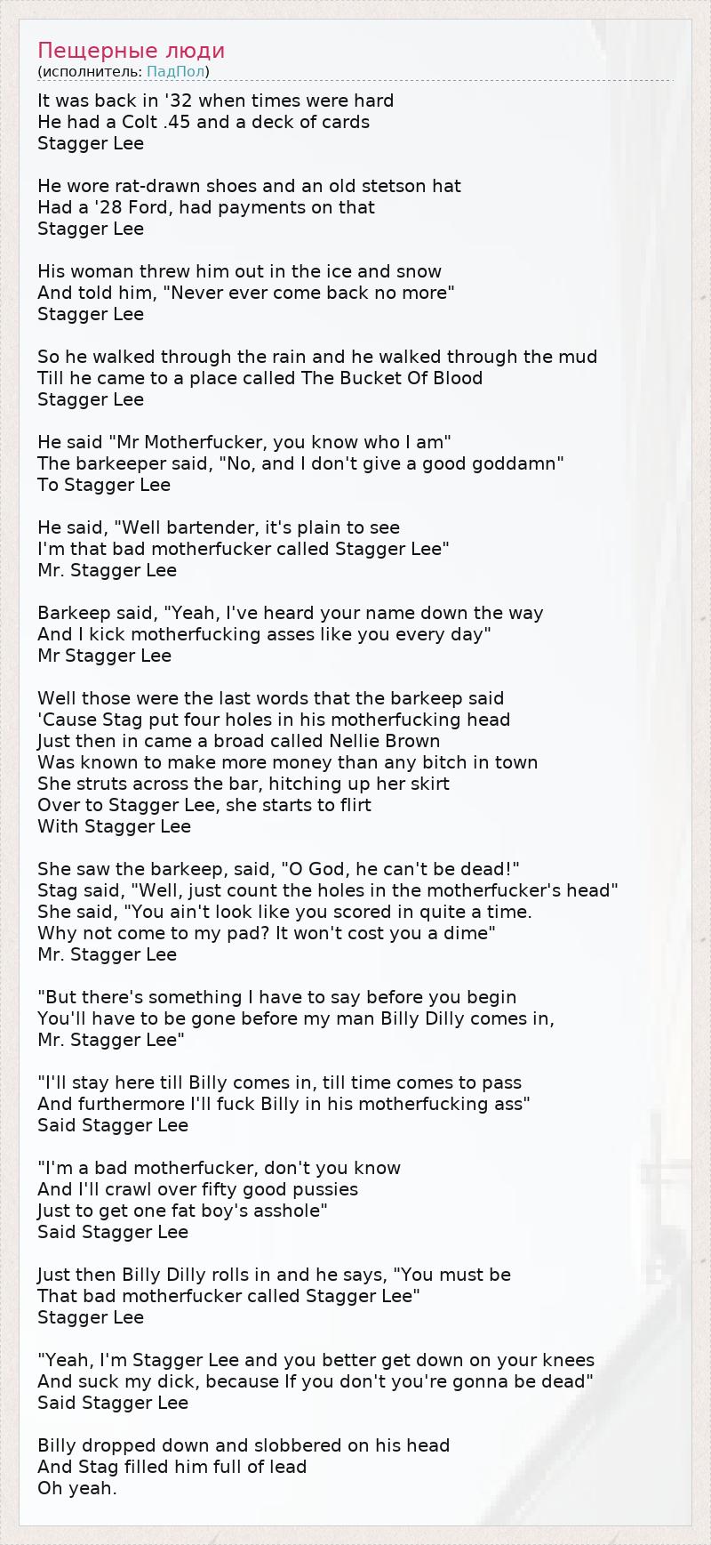 Оно вернулось в 32-м, в те тяжелые дни, У него был "кольт" 45 калибра и колода карт. "Стаггер" Ли. Он носил драные ботинки и старую ковбойскую шляпу, У него был "форд" 28 года, целиком оплаченный. "Стаггер" Ли. Его женщина бросила его среди снегов и льда, А на прощание сказала "Никогда больше не возвращайся" "Стаггер" Ли. И он пошел сквозь дождь, пошел по грязи, Пока не добрался до местечка под названием "Ведро Крови". "Стаггер" Ли. Он сказал: "Эй, ублюдок, ты знаешь, кто я". Бармен ответил: "Нет, и ни черта ты здесь не получишь" "Стаггеру" Ли. Тот ответил: "Ну, бармен, это же так просто, Я тот самый конченый подонок "Стаггер" Ли, Господин "Стаггер" Ли". Бармен сказал: "Ага, слыхал я твое имя где-то там, И я вышвыриваю таких засранцев, как ты, каждый день, Господин "Стаггер" Ли". Н-да, это были последние слова, что бармену довелось сказать, Поскольку Стаг проделал четыре дыры в его бестолковой башке. Вскоре вошла проститутка по имени Нелли Браун, Что, как известно, зарабатывала больше других суч*к в городе. Она оперлась на стойку бара, подтянула юбку Перед "Стаггером" Ли, она стала заигрывать Со "Стаггером" Ли. Она увидела бармена и сказала: "Боже, неужели он мертв!" Стаг ответил: "Просто посчитай дыры в его бестолковой башке" Она сказала: "Не похоже, чтобы ты вел счет в последнее время. Почему бы не отправиться в постель? С тебя ни копейки не возьму, Господин "Стаггер" Ли". "Но прежде, чем начнем, должна предупредить, Тебе придется убраться до того, как придет мой дружок Билли Дилли, Господин "Стаггер" Ли". "Я буду здесь, пока не придет Билли, пока не пробьет его час, И, более того, я порву его паршивую зад**цу", - Сказал "Стаггер" Ли. "Я конченый подонок, разве ты не знаешь, И я переползу через полсотни хорошеньких девочек, Лишь бы добраться до задницы одного жирдяя", - Сказал "Стаггер" Ли. Тут же, войдя, Билли Дилли сказал: "Должно быть, Ты – тот конченый подонок "Стаггер" Ли". "Стаггер" Ли. "Да, я "Стаггер" Ли, и тебе лучше опуститься на колени И взять в рот, если, конечно, ты не хочешь умереть", - Сказал "Стаггер" Ли. Билли опустился и распустил слюни, И Стаг разрядил в него обойму. О, да... * "Стаггер" - прозвище реального американского убийцы Ли Шелтона.