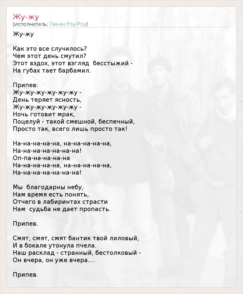 Жу-жу Как это все случилось? Чем этот день смутил? Этот вздох, этот взгляд бесстыжий - На губах тает барбамил. Припев: Жу-жу-жу-жу-жу-жу - День теряет ясность, Жу-жу-жу-жу-жу-жу - Ночь готовит мрак, Поцелуй - такой смешной, беспечный, Просто так, всего лишь просто так! На-на-на-на-на, на-на-на-на-на, На-на-на-на-на-на-на! Оп-па-на-на-на-на На-на-на-на-на, на-на-на-на-на, На-на-на-на-на-на-на! Мы благодарны небу, Нам время есть понять, Отчего в лабиринтах страсти Нам судьба не дает пропасть. Припев. Смят, смят, смят бантик твой лиловый, И в бокале утонула пчела. Наш расклад - странный, бестолковый - Он вчера, он уже вчера.... Припев.