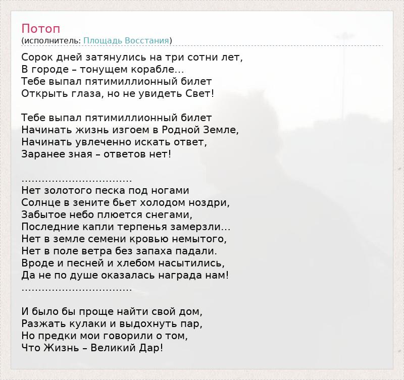 Сорок дней затянулись на три сотни лет, В городе – тонущем корабле… Тебе выпал пятимиллионный билет Открыть глаза, но не увидеть Свет! Тебе выпал пятимиллионный билет Начинать жизнь изгоем в Родной Земле, Начинать увлеченно искать ответ, Заранее зная – ответов нет! …………………………… Нет золотого песка под ногами Солнце в зените бьет холодом ноздри, Забытое небо плюется снегами, Последние капли терпенья замерзли… Нет в земле семени кровью немытого, Нет в поле ветра без запаха падали. Вроде и песней и хлебом насытились, Да не по душе оказалась награда нам! …………………………… И было бы проще найти свой дом, Разжать кулаки и выдохнуть пар, Но предки мои говорили о том, Что Жизнь – Великий Дар!