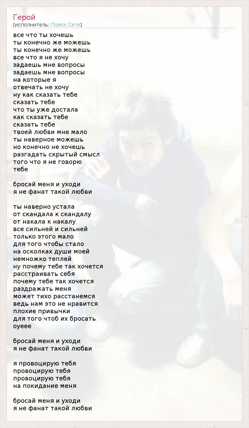 все что ты хочешь ты конечно же можешь ты конечно же можешь все что я не хочу задаешь мне вопросы задаешь мне вопросы на которые я отвечать не хочу ну как сказать тебе сказать тебе что ты уже достала как сказать тебе сказать тебе твоей любви мне мало ты наверное можешь но конечно не хочешь разгадать скрытый смысл того что я не говорю тебе бросай меня и уходи я не фанат такой любви ты наверно устала от скандала к скандалу от накала к накалу все сильней и сильней только этого мало для того чтобы стало на осколках души моей немножко теплей ну почему тебе так хочется расстраивать себя почему тебе так хочется раздражать меня может тихо расстанемся ведь нам это не нравится плохие привычки для того чтоб их бросать оуеее бросай меня и уходи я не фанат такой любви я провоцирую тебя провоцирую тебя провоцирую тебя на покидание меня бросай меня и уходи я не фанат такой любви