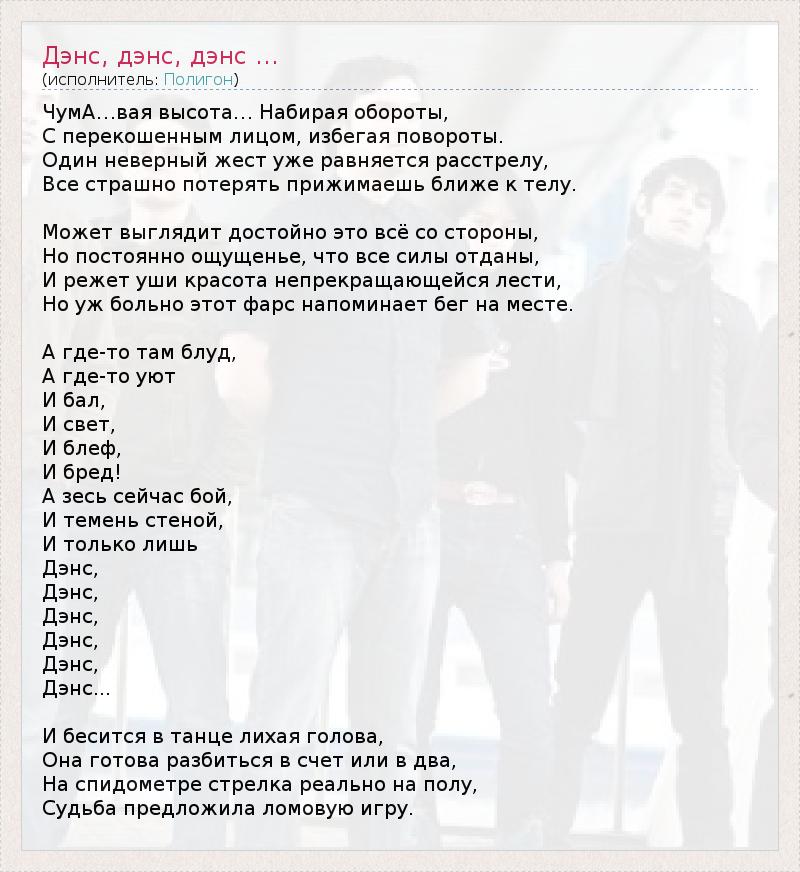 ЧумА…вая высота… Набирая обороты, С перекошенным лицом, избегая повороты. Один неверный жест уже равняется расстрелу, Все страшно потерять прижимаешь ближе к телу. Может выглядит достойно это всё со стороны, Но постоянно ощущенье, что все силы отданы, И режет уши красота непрекращающейся лести, Но уж больно этот фарс напоминает бег на месте. А где-то там блуд, А где-то уют И бал, И свет, И блеф, И бред! А зесь сейчас бой, И темень стеной, И только лишь Дэнс, Дэнс, Дэнс, Дэнс, Дэнс, Дэнс... И бесится в танце лихая голова, Она готова разбиться в счет или в два, На спидометре стрелка реально на полу, Судьба предложила ломовую игру.