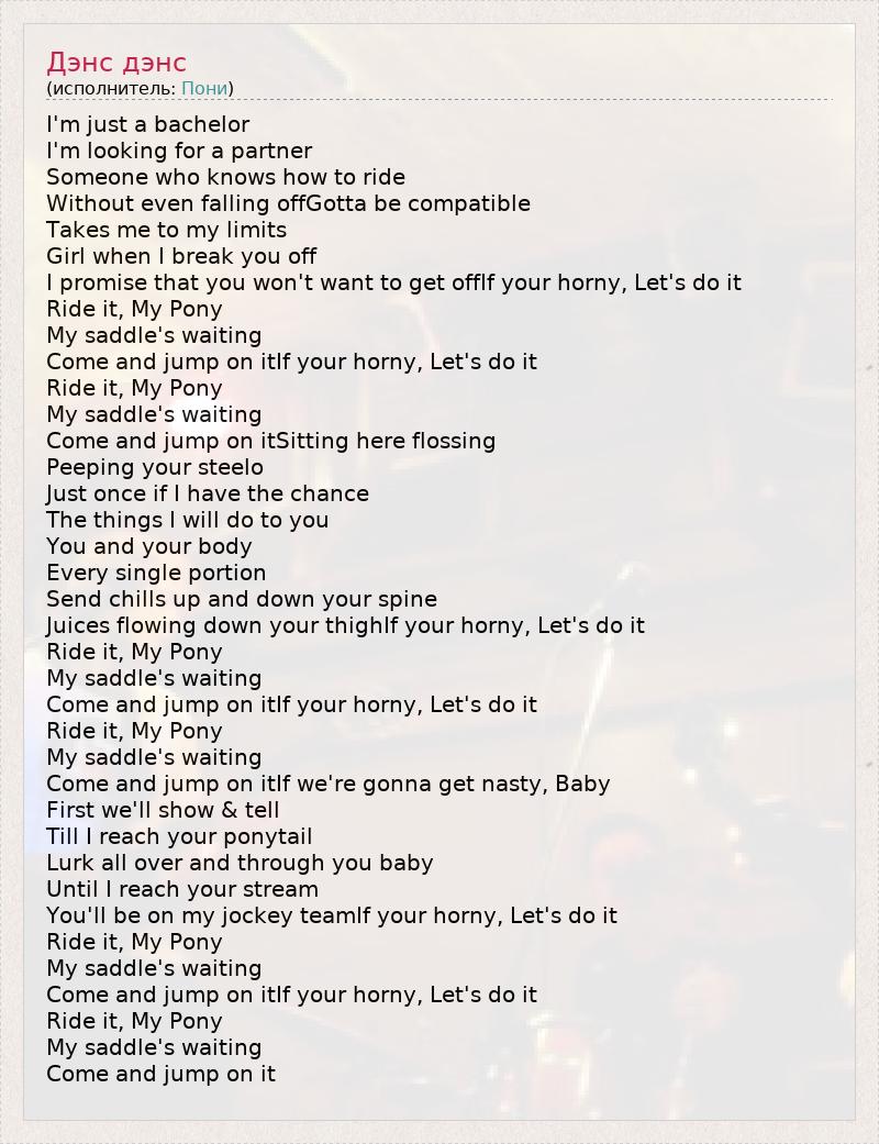 I'm just a bachelor I'm looking for a partner Someone who knows how to ride Without even falling offGotta be compatible Takes me to my limits Girl when I break you off I promise that you won't want to get offIf your horny, Let's do it Ride it, My Pony My saddle's waiting Come and jump on itIf your horny, Let's do it Ride it, My Pony My saddle's waiting Come and jump on itSitting here flossing Peeping your steelo Just once if I have the chance The things I will do to you You and your body Every single portion Send chills up and down your spine Juices flowing down your thighIf your horny, Let's do it Ride it, My Pony My saddle's waiting Come and jump on itIf your horny, Let's do it Ride it, My Pony My saddle's waiting Come and jump on itIf we're gonna get nasty, Baby First we'll show & tell Till I reach your ponytail Lurk all over and through you baby Until I reach your stream You'll be on my jockey teamIf your horny, Let's do it Ride it, My Pony My saddle's waiting Come and jump on itIf your horny, Let's do it Ride it, My Pony My saddle's waiting Come and jump on it