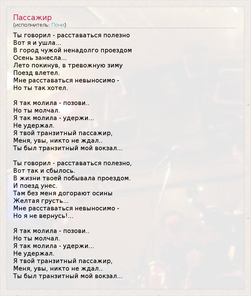 Ты говорил - расставаться полезно Вот я и ушла... В город чужой ненадолго проездом Осень занесла... Лето покинув, в тревожную зиму Поезд влетел. Мне расставаться невыносимо - Но ты так хотел. Я так молила - позови.. Но ты молчал. Я так молила - удержи... Не удержал. Я твой транзитный пассажир, Меня, увы, никто не ждал.. Ты был транзитный мой вокзал... Ты говорил - расставаться полезно, Вот так и сбылось. В жизни твоей побывала проездом. И поезд унес. Там без меня догорают осины Желтая грусть... Мне расставаться невыносимо - Но я не вернусь!... Я так молила - позови.. Но ты молчал. Я так молила - удержи... Не удержал. Я твой транзитный пассажир, Меня, увы, никто не ждал.. Ты был транзитный мой вокзал...