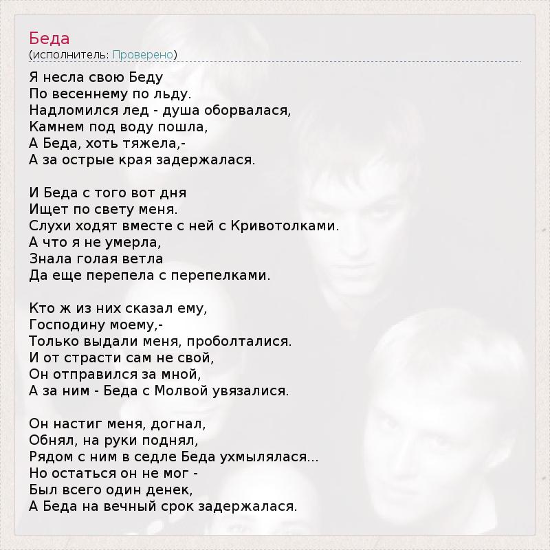 Я несла свою Беду По весеннему по льду. Надломился лед - душа оборвалася, Камнем под воду пошла, А Беда, хоть тяжела,- А за острые края задержалася. И Беда с того вот дня Ищет по свету меня. Слухи ходят вместе с ней с Кривотолками. А что я не умерла, Знала голая ветла Да еще перепела с перепелками. Кто ж из них сказал ему, Господину моему,- Только выдали меня, проболталися. И от страсти сам не свой, Он отправился за мной, А за ним - Беда с Молвой увязалися. Он настиг меня, догнал, Обнял, на руки поднял, Рядом с ним в седле Беда ухмылялася... Но остаться он не мог - Был всего один денек, А Беда на вечный срок задержалася.
