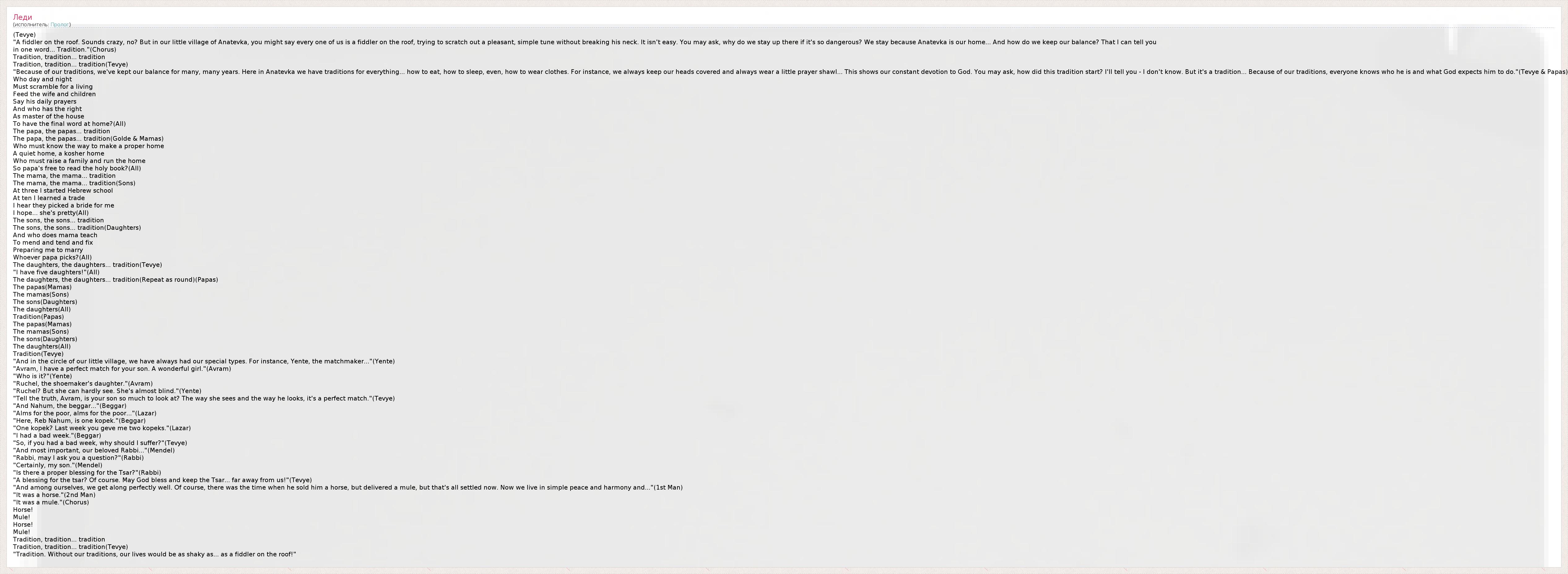 (Tevye) "A fiddler on the roof. Sounds crazy, no? But in our little village of Anatevka, you might say every one of us is a fiddler on the roof, trying to scratch out a pleasant, simple tune without breaking his neck. It isn't easy. You may ask, why do we stay up there if it's so dangerous? We stay because Anatevka is our home... And how do we keep our balance? That I can tell you in one word... Tradition."(Chorus) Tradition, tradition... tradition Tradition, tradition... tradition(Tevye) "Because of our traditions, we've kept our balance for many, many years. Here in Anatevka we have traditions for everything... how to eat, how to sleep, even, how to wear clothes. For instance, we always keep our heads covered and always wear a little prayer shawl... This shows our constant devotion to God. You may ask, how did this tradition start? I'll tell you - I don't know. But it's a tradition... Because of our traditions, everyone knows who he is and what God expects him to do."(Tevye & Papas) Who day and night Must scramble for a living Feed the wife and children Say his daily prayers And who has the right As master of the house To have the final word at home?(All) The papa, the papas... tradition The papa, the papas... tradition(Golde & Mamas) Who must know the way to make a proper home A quiet home, a kosher home Who must raise a family and run the home So papa's free to read the holy book?(All) The mama, the mama... tradition The mama, the mama... tradition(Sons) At three I started Hebrew school At ten I learned a trade I hear they picked a bride for me I hope... she's pretty(All) The sons, the sons... tradition The sons, the sons... tradition(Daughters) And who does mama teach To mend and tend and fix Preparing me to marry Whoever papa picks?(All) The daughters, the daughters... tradition(Tevye) "I have five daughters!"(All) The daughters, the daughters... tradition(Repeat as round)(Papas) The papas(Mamas) The mamas(Sons) The sons(Daughters) The daughters(All) Tradition(Papas) The papas(Mamas) The mamas(Sons) The sons(Daughters) The daughters(All) Tradition(Tevye) "And in the circle of our little village, we have always had our special types. For instance, Yente, the matchmaker..."(Yente) "Avram, I have a perfect match for your son. A wonderful girl."(Avram) "Who is it?"(Yente) "Ruchel, the shoemaker's daughter."(Avram) "Ruchel? But she can hardly see. She's almost blind."(Yente) "Tell the truth, Avram, is your son so much to look at? The way she sees and the way he looks, it's a perfect match."(Tevye) "And Nahum, the beggar..."(Beggar) "Alms for the poor, alms for the poor..."(Lazar) "Here, Reb Nahum, is one kopek."(Beggar) "One kopek? Last week you geve me two kopeks."(Lazar) "I had a bad week."(Beggar) "So, if you had a bad week, why should I suffer?"(Tevye) "And most important, our beloved Rabbi..."(Mendel) "Rabbi, may I ask you a question?"(Rabbi) "Certainly, my son."(Mendel) "Is there a proper blessing for the Tsar?"(Rabbi) "A blessing for the tsar? Of course. May God bless and keep the Tsar... far away from us!"(Tevye) "And among ourselves, we get along perfectly well. Of course, there was the time when he sold him a horse, but delivered a mule, but that's all settled now. Now we live in simple peace and harmony and..."(1st Man) "It was a horse."(2nd Man) "It was a mule."(Chorus) Horse! Mule! Horse! Mule! Tradition, tradition... tradition Tradition, tradition... tradition(Tevye) "Tradition. Without our traditions, our lives would be as shaky as... as a fiddler on the roof!"