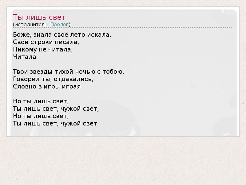 Боже, знала свое лето искала, Свои строки писала, Никому не читала, Читала Твои звезды тихой ночью с тобою, Говорил ты, отдавались, Словно в игры играя Но ты лишь свет, Ты лишь свет, чужой свет, Но ты лишь свет, Ты лишь свет, чужой свет
