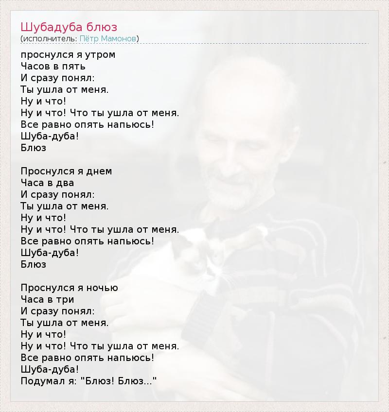 проснулся я утром Часов в пять И сразу понял: Ты ушла от меня. Ну и что! Ну и что! Что ты ушла от меня. Все равно опять напьюсь! Шуба-дуба! Блюз Проснулся я днем Часа в два И сразу понял: Ты ушла от меня. Ну и что! Ну и что! Что ты ушла от меня. Все равно опять напьюсь! Шуба-дуба! Блюз Проснулся я ночью Часа в три И сразу понял: Ты ушла от меня. Ну и что! Ну и что! Что ты ушла от меня. Все равно опять напьюсь! Шуба-дуба! Подумал я: "Блюз! Блюз..."