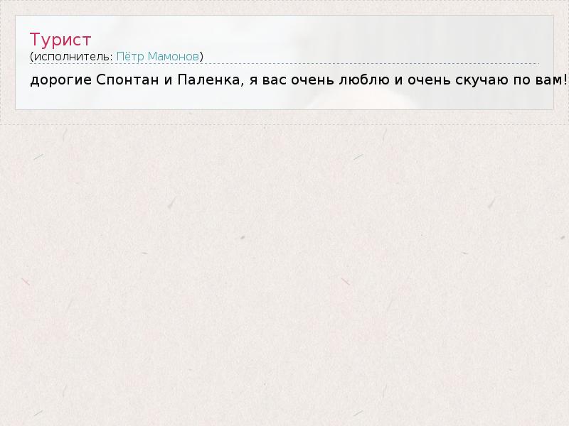 Это интересно:Пётр Николаевич Мамонов - лидер московской рок-группы "Звуки му". Попутно принимал участие в съёмках фильмов (Игла, Такси-блюз и прочее). В начале 90-х распустил группу, продолжил выступать с гитаристом "Звуков…" Алексеем Бортничуком под вывеской "Мамонов и Алексей".Сейчас продолжает сниматься в кино (Остров, Пыль) и работать в театре, регулярно давая моноспектакли.... продолжение