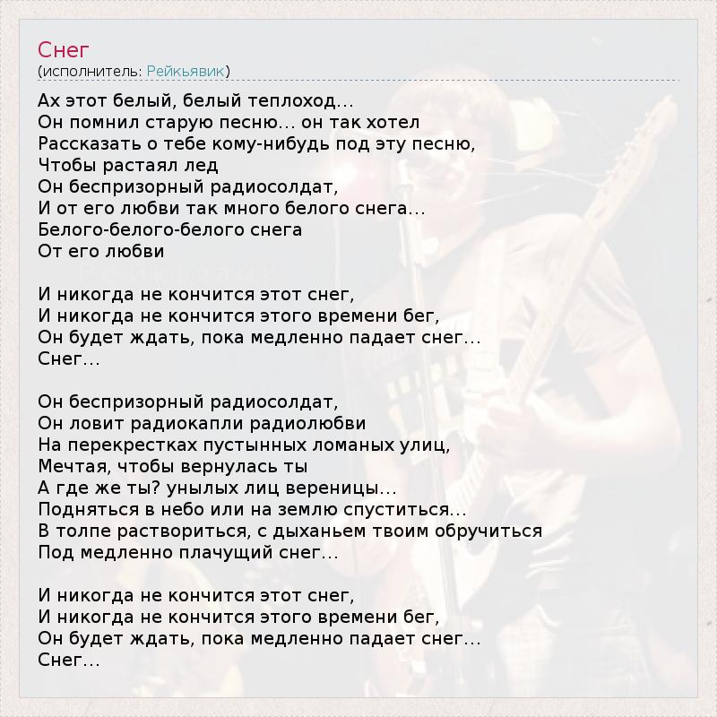 Ах этот белый, белый теплоход… Он помнил старую песню… он так хотел Рассказать о тебе кому-нибудь под эту песню, Чтобы растаял лед Он беспризорный радиосолдат, И от его любви так много белого снега… Белого-белого-белого снега От его любви И никогда не кончится этот снег, И никогда не кончится этого времени бег, Он будет ждать, пока медленно падает снег… Снег… Он беспризорный радиосолдат, Он ловит радиокапли радиолюбви На перекрестках пустынных ломаных улиц, Мечтая, чтобы вернулась ты А где же ты? унылых лиц вереницы… Подняться в небо или на землю спуститься… В толпе раствориться, с дыханьем твоим обручиться Под медленно плачущий снег… И никогда не кончится этот снег, И никогда не кончится этого времени бег, Он будет ждать, пока медленно падает снег… Снег…