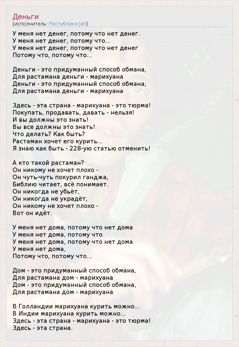 У меня нет денег, потому что нет денег. У меня нет денег, потому что... У меня нет денег, потому что нет денег Потому что, потому что... Деньги - это придуманный способ обмана, Для растамана деньги - марихуана Деньги - это придуманный способ обмана, Для растамана деньги - марихуана Здесь - эта страна - марихуана - это тюрма! Покупать, продавать, давать - нельзя! И вы должны это знать! Вы все должны это знать! Что делать? Как быть? Растаман хочет его курить... Я знаю как быть - 228-ую статью отменить! А кто такой растаман? Он никому не хочет плохо - Он чуть-чуть покурил ганджа, Библию читает, всё понимает. Он никогда не убьёт, Он никогда не украдёт, Он никому не хочет плохо - Вот он идёт. У меня нет дома, потому что нет дома У меня нет дома, потому что У меня нет дома, потому что нет дома У меня нет дома, Потому что, потому что... Дом - это придуманный способ обмана, Для растамана дом - марихуана Дом - это придуманный способ обмана, Для растамана дом - марихуана В Голландии марихуана курить можно... В Индии марихуана курить можно... Здесь - эта страна - марихуана - это тюрма! Здесь - эта страна.
