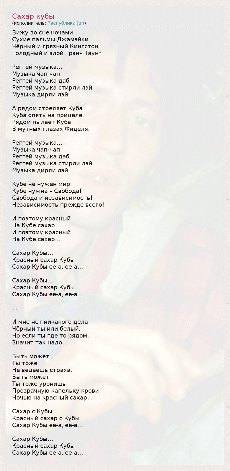 Вижу во сне ночами Сухие пальмы Джамэйки Чёрный и грязный Кингстон Голодный и злой Трэнч Таун* Реггей музыка… Музыка чап-чап Реггей музыка даб Реггей музыка стирли лэй Музыка дирли лэй А рядом стреляет Куба. Куба опять на прицеле. Рядом пылает Куба В мутных глазах Фиделя. Реггей музыка… Музыка чап-чап Реггей музыка даб Реггей музыка стирли лэй Музыка дирли лэй. Кубе не нужен мир. Кубе нужна – Свобода! Свобода и независимость! Независимость прежде всего! И поэтому красный На Кубе сахар… И поэтому красный На Кубе сахар… Сахар Кубы… Красный сахар Кубы Сахар Кубы ее-а, ее-а… Сахар Кубы… Красный сахар Кубы Сахар Кубы ее-а, ее-а… … И мне нет никакого дела Чёрный ты или белый. Но если ты где то рядом, Значит так надо… Быть может Ты тоже Не ведаешь страха. Быть может Ты тоже уронишь Прозрачную капельку крови Ночью на красный сахар… Сахар с Кубы… Красный сахар с Кубы Сахар Кубы ее-а, ее-а… Сахар Кубы… Красный сахар Кубы Сахар Кубы ее-а, ее-а…