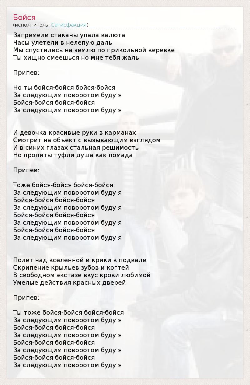 Загремели стаканы упала валюта Часы улетели в нелепую даль Мы спустились на землю по прикольной веревке Ты хищно смеешься но мне тебя жаль Припев: Но ты бойся-бойся бойся-бойся За следующим поворотом буду я Бойся-бойся бойся-бойся За следующим поворотом буду я И девочка красивые руки в карманах Смотрит на объект с вызывающим взглядом И в синих глазах стальная решимость Но пропиты туфли душа как помада Припев: Тоже бойся-бойся бойся-бойся За следующим поворотом буду я Бойся-бойся бойся-бойся За следующим поворотом буду я Бойся-бойся бойся-бойся За следующим поворотом буду я Бойся-бойся бойся-бойся За следующим поворотом буду я Полет над вселенной и крики в подвале Скрипение крыльев зубов и когтей В свободном экстазе вкус крови любимой Умелые действия красных дверей Припев: Ты тоже бойся-бойся бойся-бойся За следующим поворотом буду я Бойся-бойся бойся-бойся За следующим поворотом буду я Бойся-бойся бойся-бойся За следующим поворотом буду я Бойся-бойся бойся-бойся За следующим поворотом буду я
