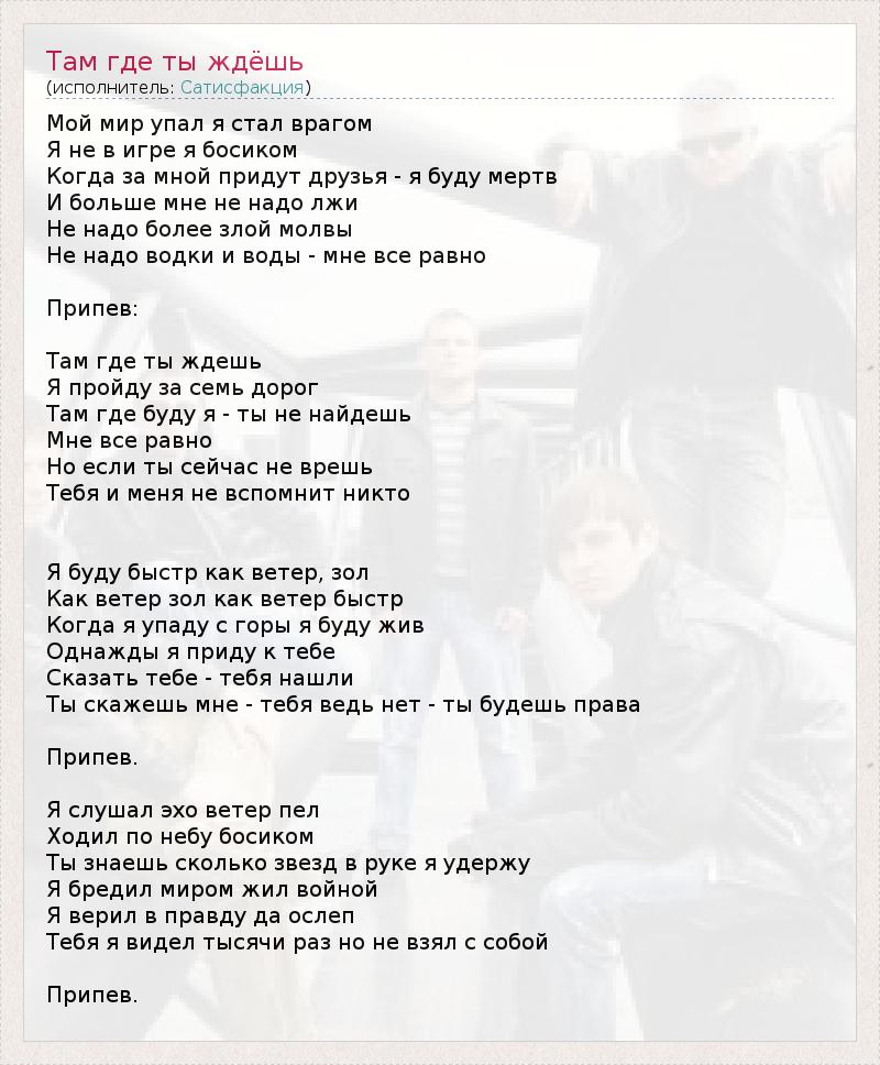 Мой мир упал я стал врагом Я не в игре я босиком Когда за мной придут друзья - я буду мертв И больше мне не надо лжи Не надо более злой молвы Не надо водки и воды - мне все равно Припев: Там где ты ждешь Я пройду за семь дорог Там где буду я - ты не найдешь Мне все равно Но если ты сейчас не врешь Тебя и меня не вспомнит никто Я буду быстр как ветер, зол Как ветер зол как ветер быстр Когда я упаду с горы я буду жив Однажды я приду к тебе Сказать тебе - тебя нашли Ты скажешь мне - тебя ведь нет - ты будешь права Припев. Я слушал эхо ветер пел Ходил по небу босиком Ты знаешь сколько звезд в руке я удержу Я бредил миром жил войной Я верил в правду да ослеп Тебя я видел тысячи раз но не взял с собой Припев.