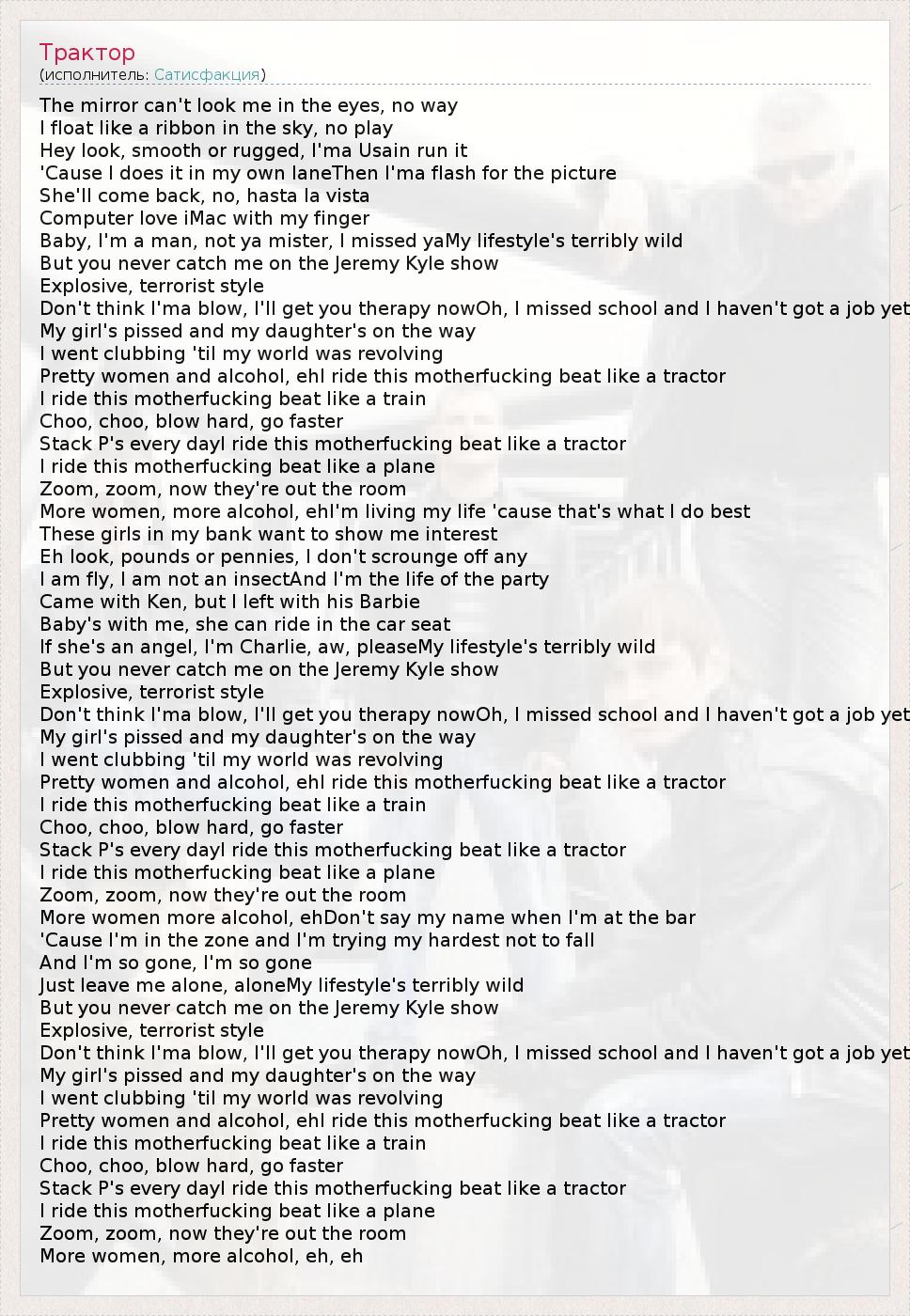 The mirror can't look me in the eyes, no way I float like a ribbon in the sky, no play Hey look, smooth or rugged, I'ma Usain run it 'Cause I does it in my own laneThen I'ma flash for the picture She'll come back, no, hasta la vista Computer love iMac with my finger Baby, I'm a man, not ya mister, I missed yaMy lifestyle's terribly wild But you never catch me on the Jeremy Kyle show Explosive, terrorist style Don't think I'ma blow, I'll get you therapy nowOh, I missed school and I haven't got a job yet My girl's pissed and my daughter's on the way I went clubbing 'til my world was revolving Pretty women and alcohol, ehI ride this motherfucking beat like a tractor I ride this motherfucking beat like a train Choo, choo, blow hard, go faster Stack P's every dayI ride this motherfucking beat like a tractor I ride this motherfucking beat like a plane Zoom, zoom, now they're out the room More women, more alcohol, ehI'm living my life 'cause that's what I do best These girls in my bank want to show me interest Eh look, pounds or pennies, I don't scrounge off any I am fly, I am not an insectAnd I'm the life of the party Came with Ken, but I left with his Barbie Baby's with me, she can ride in the car seat If she's an angel, I'm Charlie, aw, pleaseMy lifestyle's terribly wild But you never catch me on the Jeremy Kyle show Explosive, terrorist style Don't think I'ma blow, I'll get you therapy nowOh, I missed school and I haven't got a job yet My girl's pissed and my daughter's on the way I went clubbing 'til my world was revolving Pretty women and alcohol, ehI ride this motherfucking beat like a tractor I ride this motherfucking beat like a train Choo, choo, blow hard, go faster Stack P's every dayI ride this motherfucking beat like a tractor I ride this motherfucking beat like a plane Zoom, zoom, now they're out the room More women more alcohol, ehDon't say my name when I'm at the bar 'Cause I'm in the zone and I'm trying my hardest not to fall And I'm so gone, I'm so gone Just leave me alone, aloneMy lifestyle's terribly wild But you never catch me on the Jeremy Kyle show Explosive, terrorist style Don't think I'ma blow, I'll get you therapy nowOh, I missed school and I haven't got a job yet My girl's pissed and my daughter's on the way I went clubbing 'til my world was revolving Pretty women and alcohol, ehI ride this motherfucking beat like a tractor I ride this motherfucking beat like a train Choo, choo, blow hard, go faster Stack P's every dayI ride this motherfucking beat like a tractor I ride this motherfucking beat like a plane Zoom, zoom, now they're out the room More women, more alcohol, eh, eh