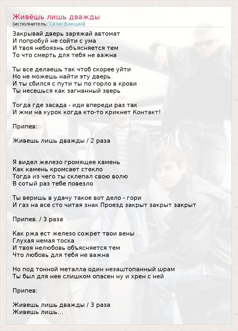 Закрывай дверь заряжай автомат И попробуй не сойти с ума И твоя небоязнь объясняется тем То что смерть для тебя не важна Ты все делаешь так чтоб скорее уйти Но не можешь найти эту дверь И ты сбился с пути ты по горло в крови Ты несешься как загнанный зверь Тогда где засада - иди впереди раз так И жми на курок когда кто-то крикнет Контакт! Припев: Живешь лишь дважды / 2 раза Я видел железо громящее камень Как камень кромсает стекло Тогда из чего ты склепал свою волю В сотый раз тебе повезло Ты веришь в удачу такое вот дело - гори И газ на все сто читая знак Проезд закрыт закрыт закрыт Припев. / 3 раза Как ржа ест железо сожрет твои вены Глухая немая тоска И твоя нелюбовь объясняется тем Что любовь для тебя не важна Но под тонной металла один незаштопанный шрам Ты был для нее слишком опасен ну и хрен с ней Припев: Живешь лишь дважды / 3 раза Живешь лишь…