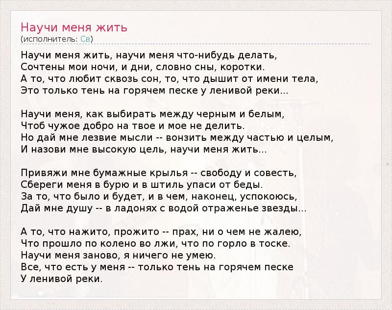 Научи меня жить, научи меня что-нибудь делать, Сочтены мои ночи, и дни, словно сны, коротки. А то, что любит сквозь сон, то, что дышит от имени тела, Это только тень на горячем песке у ленивой реки... Научи меня, как выбирать между черным и белым, Чтоб чужое добро на твое и мое не делить. Но дай мне лезвие мысли -- вонзить между частью и целым, И назови мне высокую цель, научи меня жить... Привяжи мне бумажные крылья -- свободу и совесть, Сбереги меня в бурю и в штиль упаси от беды. За то, что было и будет, и в чем, наконец, успокоюсь, Дай мне душу -- в ладонях с водой отраженье звезды... А то, что нажито, прожито -- прах, ни о чем не жалею, Что прошло по колено во лжи, что по горло в тоске. Научи меня заново, я ничего не умею. Все, что есть у меня -- только тень на горячем песке У ленивой реки.
