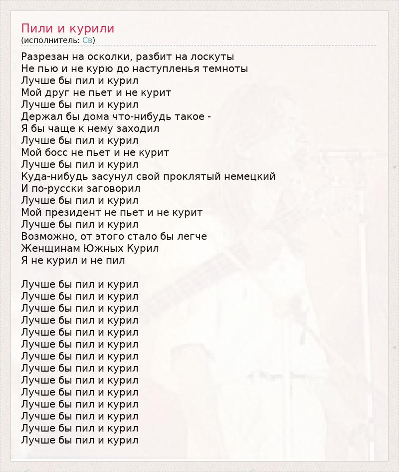 Разрезан на осколки, разбит на лоскуты Не пью и не курю до наступленья темноты Лучше бы пил и курил Мой друг не пьет и не курит Лучше бы пил и курил Держал бы дома что-нибудь такое - Я бы чаще к нему заходил Лучше бы пил и курил Мой босс не пьет и не курит Лучше бы пил и курил Куда-нибудь засунул свой проклятый немецкий И по-русски заговорил Лучше бы пил и курил Мой президент не пьет и не курит Лучше бы пил и курил Возможно, от этого стало бы легче Женщинам Южных Курил Я не курил и не пил Лучше бы пил и курил Лучше бы пил и курил Лучше бы пил и курил Лучше бы пил и курил Лучше бы пил и курил Лучше бы пил и курил Лучше бы пил и курил Лучше бы пил и курил Лучше бы пил и курил Лучше бы пил и курил Лучше бы пил и курил Лучше бы пил и курил Лучше бы пил и курил Лучше бы пил и курил