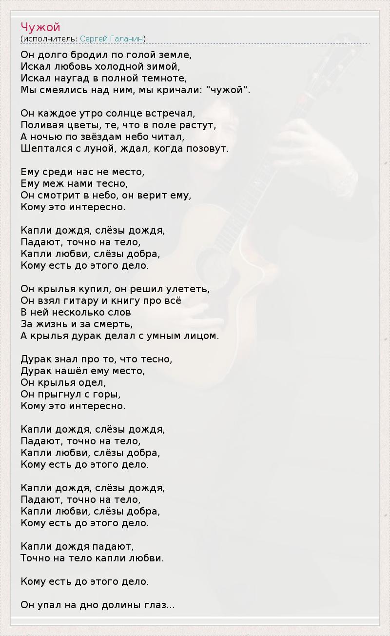 Он долго бродил по голой земле, Искал любовь холодной зимой, Искал наугад в полной темноте, Мы смеялись над ним, мы кричали: "чужой". Он каждое утро солнце встречал, Поливая цветы, те, что в поле растут, А ночью по звёздам небо читал, Шептался с луной, ждал, когда позовут. Ему среди нас не место, Ему меж нами тесно, Он смотрит в небо, он верит ему, Кому это интересно. Капли дождя, слёзы дождя, Падают, точно на тело, Капли любви, слёзы добра, Кому есть до этого дело. Он крылья купил, он решил улететь, Он взял гитару и книгу про всё В ней несколько слов За жизнь и за смерть, А крылья дурак делал с умным лицом. Дурак знал про то, что тесно, Дурак нашёл ему место, Он крылья одел, Он прыгнул с горы, Кому это интересно. Капли дождя, слёзы дождя, Падают, точно на тело, Капли любви, слёзы добра, Кому есть до этого дело. Капли дождя, слёзы дождя, Падают, точно на тело, Капли любви, слёзы добра, Кому есть до этого дело. Капли дождя падают, Точно на тело капли любви. Кому есть до этого дело. Он упал на дно долины глаз...