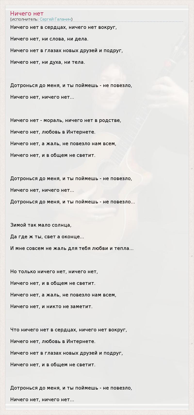 Ничего нет в сердцах, ничего нет вокруг, Ничего нет, ни слова, ни дела. Ничего нет в глазах новых друзей и подруг, Ничего нет, ни духа, ни тела. Дотронься до меня, и ты поймешь - не повезло, Ничего нет, ничего нет... Ничего нет - мораль, ничего нет в родстве, Ничего нет, любовь в Интернете. Ничего нет, а жаль, не повезло нам всем, Ничего нет, и в общем не светит. Дотронься до меня, и ты поймешь - не повезло, Ничего нет, ничего нет... Дотронься до меня, и ты поймешь - не повезло... Зимой так мало солнца, Да где ж ты, свет а оконце... И мне совсем не жаль для тебя любви и тепла... Но только ничего нет, ничего нет, Ничего нет, и в общем не светит. Ничего нет, а жаль, не повезло нам всем, Ничего нет, и никто не заметит. Что ничего нет в сердцах, ничего нет вокруг, Ничего нет, любовь в Интернете. Ничего нет в глазах новых друзей и подруг, Ничего нет, и в общем не светит. Дотронься до меня, и ты поймешь - не повезло, Ничего нет, ничего нет...