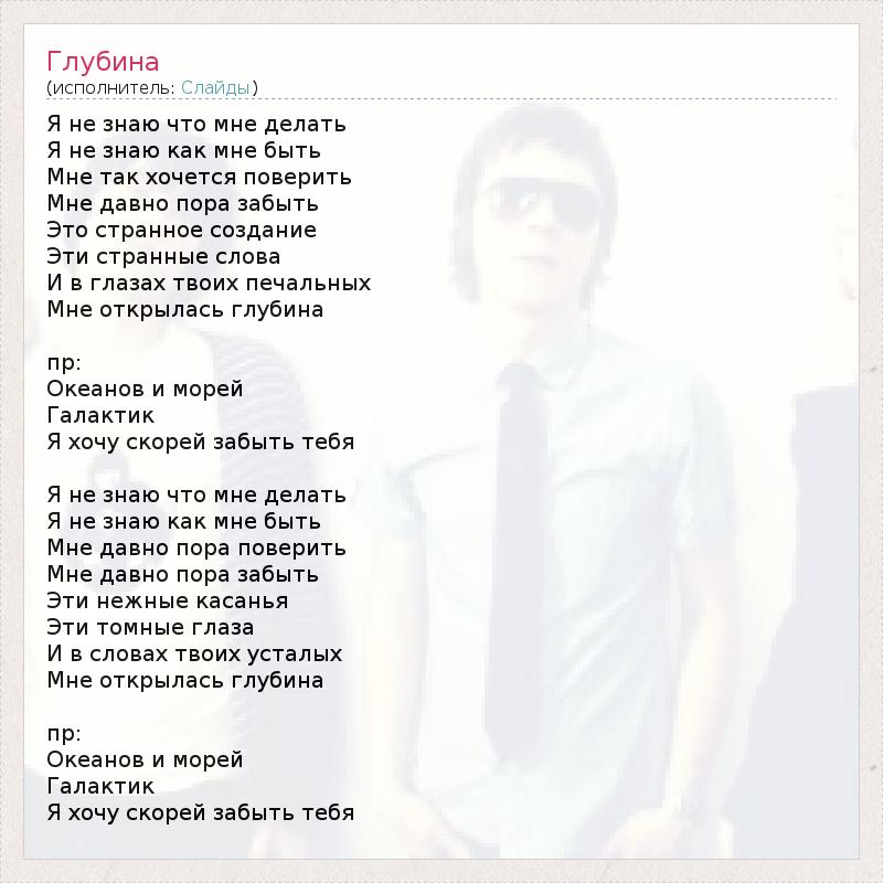 Я не знаю что мне делать Я не знаю как мне быть Мне так хочется поверить Мне давно пора забыть Это странное создание Эти странные слова И в глазах твоих печальных Мне открылась глубина пр: Океанов и морей Галактик Я хочу скорей забыть тебя Я не знаю что мне делать Я не знаю как мне быть Мне давно пора поверить Мне давно пора забыть Эти нежные касанья Эти томные глаза И в словах твоих усталых Мне открылась глубина пр: Океанов и морей Галактик Я хочу скорей забыть тебя