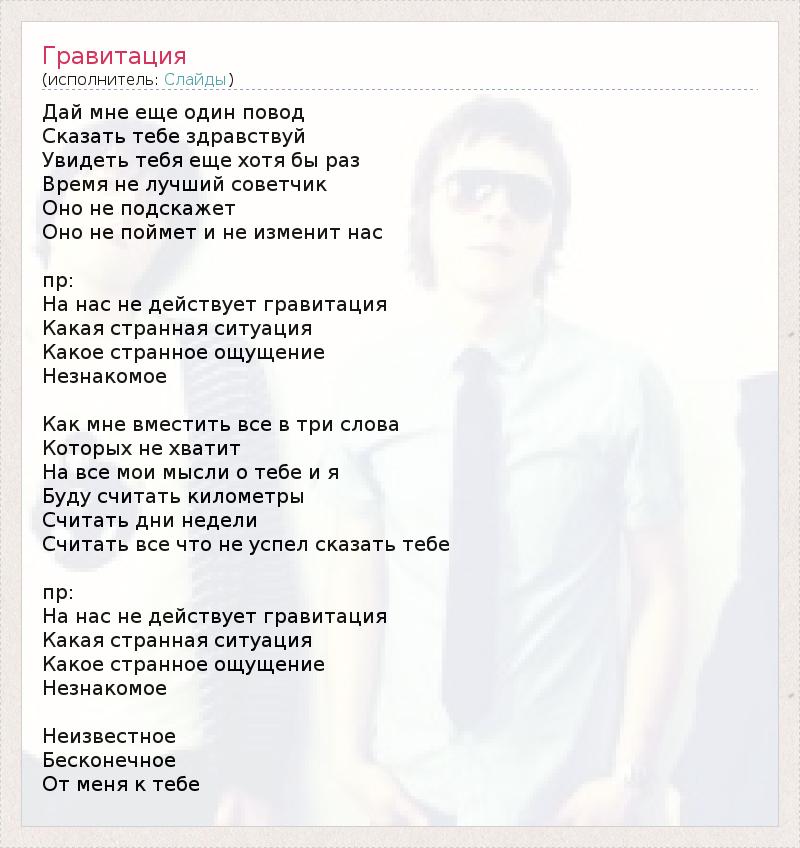Дай мне еще один повод Сказать тебе здравствуй Увидеть тебя еще хотя бы раз Время не лучший советчик Оно не подскажет Оно не поймет и не изменит нас пр: На нас не действует гравитация Какая странная ситуация Какое странное ощущение Незнакомое Как мне вместить все в три слова Которых не хватит На все мои мысли о тебе и я Буду считать километры Считать дни недели Считать все что не успел сказать тебе пр: На нас не действует гравитация Какая странная ситуация Какое странное ощущение Незнакомое Неизвестное Бесконечное От меня к тебе