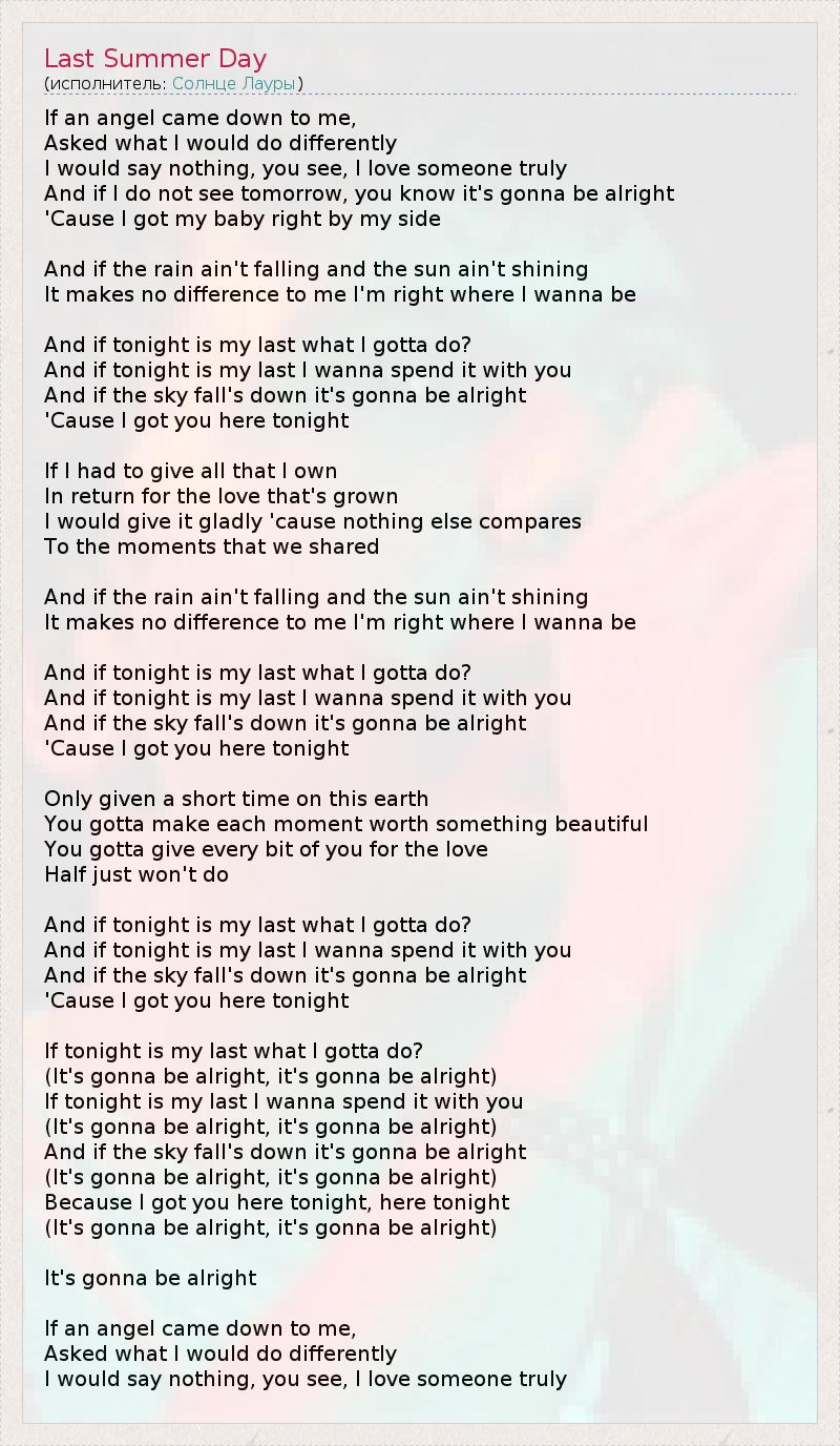 Если бы ангел спустился ко мне и спросил, Что бы я сделала по-другому в своей жизни, Я бы ответила: "Ничего, понимаешь, я искренне люблю кое-кого И если я не увижу завтрашнего дня, ты знаешь, всё будет в порядке, Потому что мой малыш рядом со мной". И если дождь не идет и солнце не светит, Для меня это не имеет значения, я там, где хочу быть. И если сегодня последний день моей жизни, что я должна сделать? И если сегодня последний день моей жизни, я хочу провести его с тобой. И если небо упадет, всё будет в порядке, Потому что сегодня вечером ты здесь со мной. И если бы я должна была отдать всё, что имею, Взамен на любовь, которая выросла между нами, Я бы охотно отдала это, потому что ничто другое не может сравниться С теми моментами, которые связывают нас. И если дождь не идет и солнце не светит, Для меня это не имеет значения, я там, где хочу быть. И если сегодня последний день моей жизни, что я должна сделать? И если сегодня последний день моей жизни, я хочу провести его с тобой. И если небо упадет, всё будет в порядке, Потому что сегодня вечером ты здесь со мной. Имея лишь короткий срок на этой земле, Ты должен делать каждый момент жизни прекрасным, Ты должен отдавать всего себя любви, Одной лишь половины недостаточно. И если сегодня последний день моей жизни, что я должна сделать? И если сегодня последний день моей жизни, я хочу провести его с тобой. И если небо упадет, всё будет в порядке, Потому что сегодня вечером ты здесь со мной. И если сегодня последний день моей жизни, что я должна сделать? (Всё будет в порядке, всё будет в порядке) И если сегодня последний день моей жизни, я хочу провести его с тобой. (Всё будет в порядке, всё будет в порядке) И если небо упадет, всё будет в порядке, (Всё будет в порядке, всё будет в порядке) Потому что сегодня вечером ты здесь со мной. (Всё будет в порядке, всё будет в порядке) Всё будет в порядке Если бы ангел спустился ко мне и спросил, Что бы я сделала по-другому в своей жизни, Я бы ответила: "Ничего, понимаешь, я искренне люблю кое-кого".
