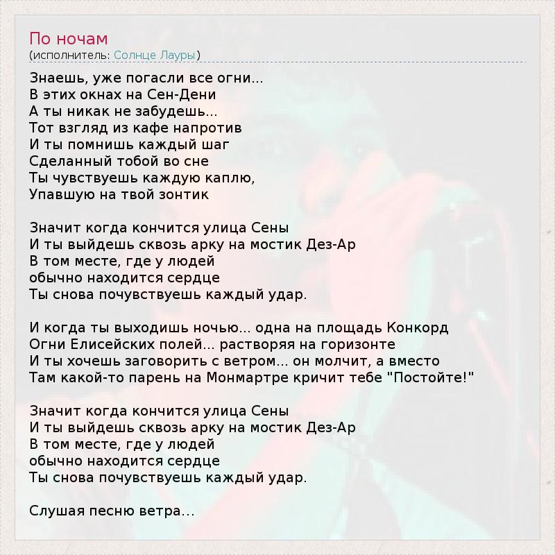 Знаешь, уже погасли все огни... В этих окнах на Сен-Дени А ты никак не забудешь... Тот взгляд из кафе напротив И ты помнишь каждый шаг Сделанный тобой во сне Ты чувствуешь каждую каплю, Упавшую на твой зонтик Значит когда кончится улица Сены И ты выйдешь сквозь арку на мостик Дез-Ар В том месте, где у людей обычно находится сердце Ты снова почувствуешь каждый удар. И когда ты выходишь ночью... одна на площадь Конкорд Огни Елисейских полей... растворяя на горизонте И ты хочешь заговорить с ветром... он молчит, а вместо Там какой-то парень на Монмартре кричит тебе "Постойте!" Значит когда кончится улица Сены И ты выйдешь сквозь арку на мостик Дез-Ар В том месте, где у людей обычно находится сердце Ты снова почувствуешь каждый удар. Слушая песню ветра…