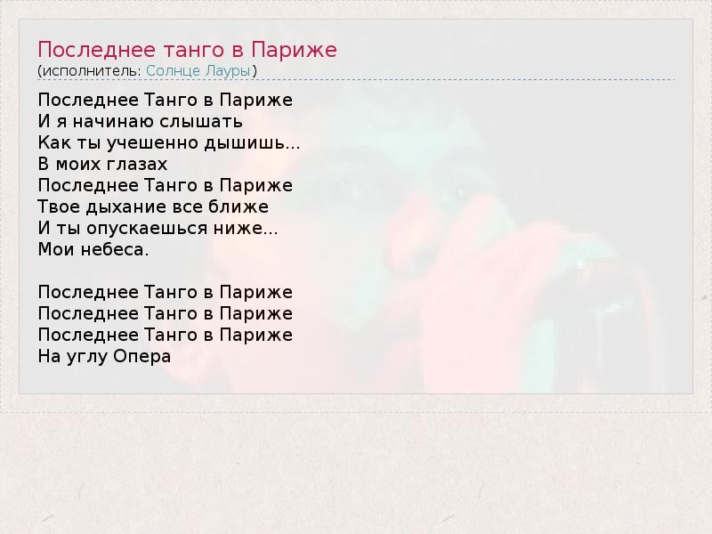 Последнее Танго в Париже И я начинаю слышать Как ты учешенно дышишь... В моих глазах Последнее Танго в Париже Твое дыхание все ближе И ты опускаешься ниже... Мои небеса. Последнее Танго в Париже Последнее Танго в Париже Последнее Танго в Париже На углу Опера