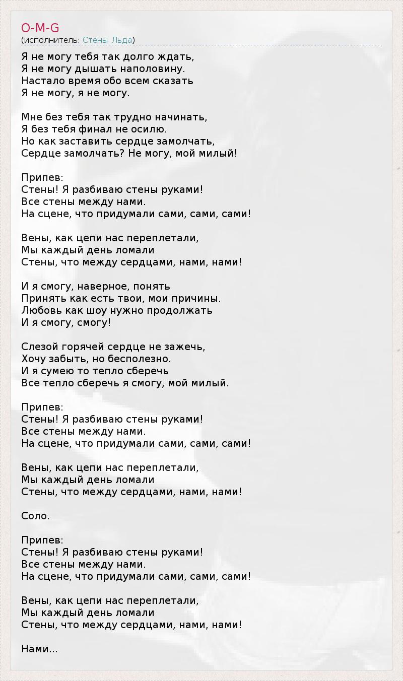 Я не могу тебя так долго ждать, Я не могу дышать наполовину. Настало время обо всем сказать Я не могу, я не могу. Мне без тебя так трудно начинать, Я без тебя финал не осилю. Но как заставить сердце замолчать, Сердце замолчать? Не могу, мой милый! Припев: Стены! Я разбиваю стены руками! Все стены между нами. На сцене, что придумали сами, сами, сами! Вены, как цепи нас переплетали, Мы каждый день ломали Стены, что между сердцами, нами, нами! И я смогу, наверное, понять Принять как есть твои, мои причины. Любовь как шоу нужно продолжать И я смогу, смогу! Слезой горячей сердце не зажечь, Хочу забыть, но бесполезно. И я сумею то тепло сберечь Все тепло сберечь я смогу, мой милый. Припев: Стены! Я разбиваю стены руками! Все стены между нами. На сцене, что придумали сами, сами, сами! Вены, как цепи нас переплетали, Мы каждый день ломали Стены, что между сердцами, нами, нами! Соло. Припев: Стены! Я разбиваю стены руками! Все стены между нами. На сцене, что придумали сами, сами, сами! Вены, как цепи нас переплетали, Мы каждый день ломали Стены, что между сердцами, нами, нами! Нами...