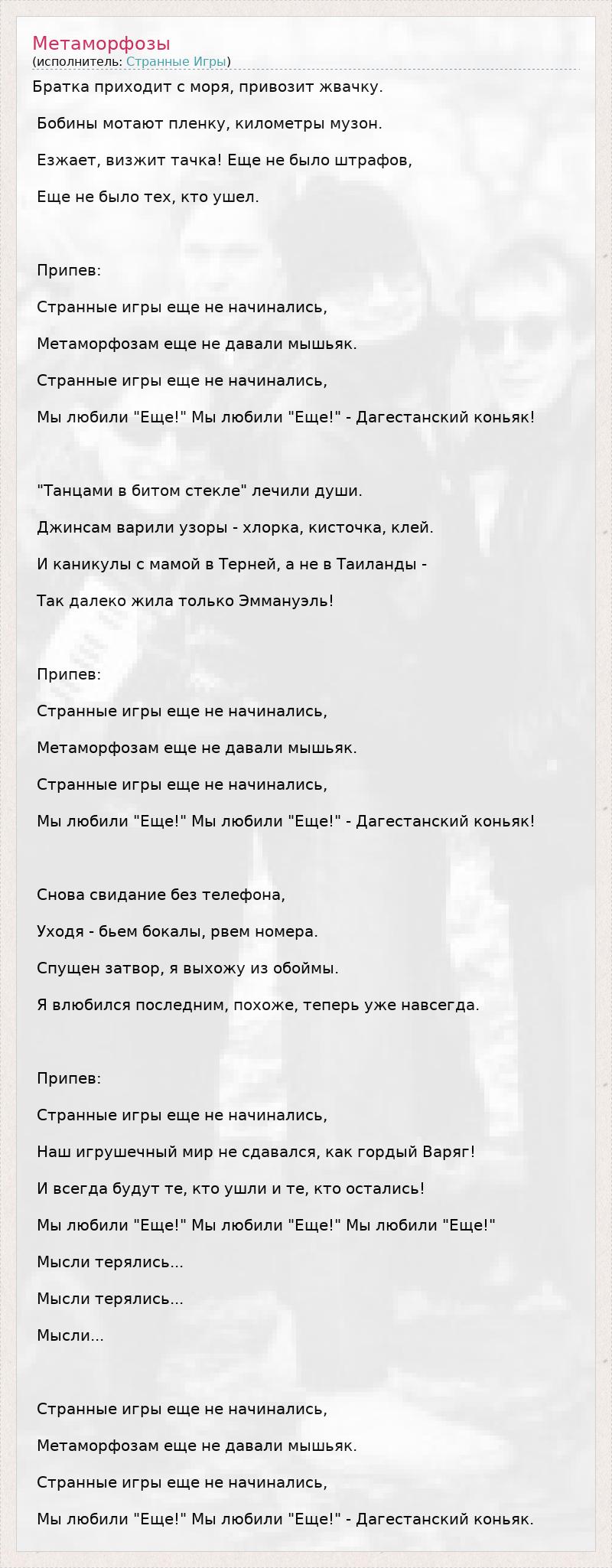 Братка приходит с моря, привозит жвачку. Бобины мотают пленку, километры музон. Езжает, визжит тачка! Еще не было штрафов, Еще не было тех, кто ушел. Припев: Странные игры еще не начинались, Метаморфозам еще не давали мышьяк. Странные игры еще не начинались, Мы любили "Еще!" Мы любили "Еще!" - Дагестанский коньяк! "Танцами в битом стекле" лечили души. Джинсам варили узоры - хлорка, кисточка, клей. И каникулы с мамой в Терней, а не в Таиланды - Так далеко жила только Эммануэль! Припев: Странные игры еще не начинались, Метаморфозам еще не давали мышьяк. Странные игры еще не начинались, Мы любили "Еще!" Мы любили "Еще!" - Дагестанский коньяк! Снова свидание без телефона, Уходя - бьем бокалы, рвем номера. Спущен затвор, я выхожу из обоймы. Я влюбился последним, похоже, теперь уже навсегда. Припев: Странные игры еще не начинались, Наш игрушечный мир не сдавался, как гордый Варяг! И всегда будут те, кто ушли и те, кто остались! Мы любили "Еще!" Мы любили "Еще!" Мы любили "Еще!" Мысли терялись... Мысли терялись... Мысли... Странные игры еще не начинались, Метаморфозам еще не давали мышьяк. Странные игры еще не начинались, Мы любили "Еще!" Мы любили "Еще!" - Дагестанский коньяк.