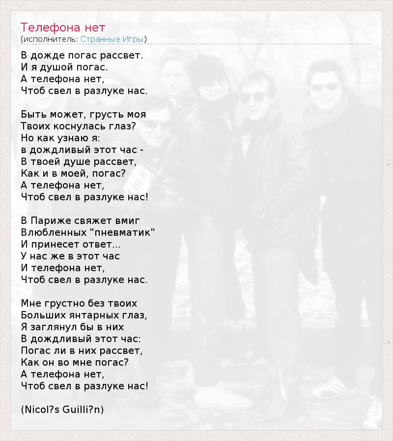 В дожде погас рассвет. И я душой погас. А телефона нет, Чтоб свел в разлуке нас. Быть может, грусть моя Твоих коснулась глаз? Но как узнаю я: в дождливый этот час - В твоей душе рассвет, Как и в моей, погас? А телефона нет, Чтоб свел в разлуке нас! В Париже свяжет вмиг Влюбленных "пневматик" И принесет ответ... У нас же в этот час И телефона нет, Чтоб свел в разлуке нас. Мне грустно без твоих Больших янтарных глаз, Я заглянул бы в них В дождливый этот час: Погас ли в них рассвет, Как он во мне погас? А телефона нет, Чтоб свел в разлуке нас! (Nicol?s Guilli?n)