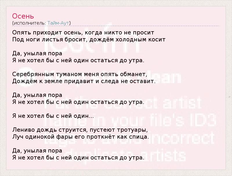Опять приходит осень, когда никто не просит Под ноги листья бросит, дождём холодным косит Да, унылая пора Я не хотел бы с ней один остаться до утра. Серебрянным туманом меня опять обманет, Дождём к земле придавит и следа не оставит. Да, унылая пора Я не хотел бы с ней один остаться до утра. Я не хотел бы с ней один... Лениво дождь струится, пустеют тротуары, Луч одинокой фары его проткнёт как спица. Да, унылая пора Я не хотел бы с ней один остаться до утра.
