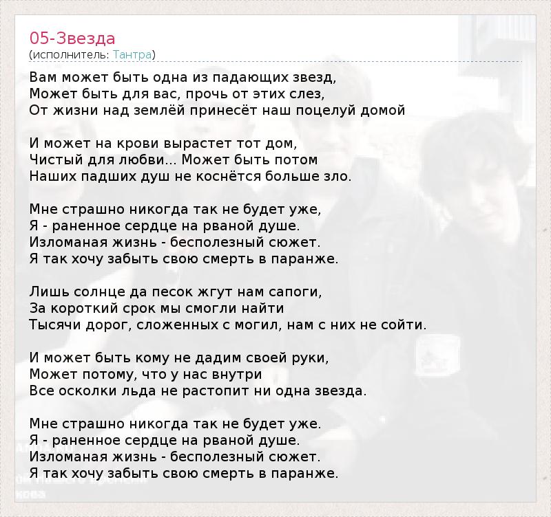 Вам может быть одна из падающих звезд, Может быть для вас, прочь от этих слез, От жизни над землёй принесёт наш поцелуй домой И может на крови вырастет тот дом, Чистый для любви... Может быть потом Наших падших душ не коснётся больше зло. Мне страшно никогда так не будет уже, Я - раненное сердце на рваной душе. Изломаная жизнь - бесполезный сюжет. Я так хочу забыть свою смерть в паранже. Лишь солнце да песок жгут нам сапоги, За короткий срок мы смогли найти Тысячи дорог, сложенных с могил, нам с них не сойти. И может быть кому не дадим своей руки, Может потому, что у нас внутри Все осколки льда не растопит ни одна звезда. Мне страшно никогда так не будет уже. Я - раненное сердце на рваной душе. Изломаная жизнь - бесполезный сюжет. Я так хочу забыть свою смерть в паранже.