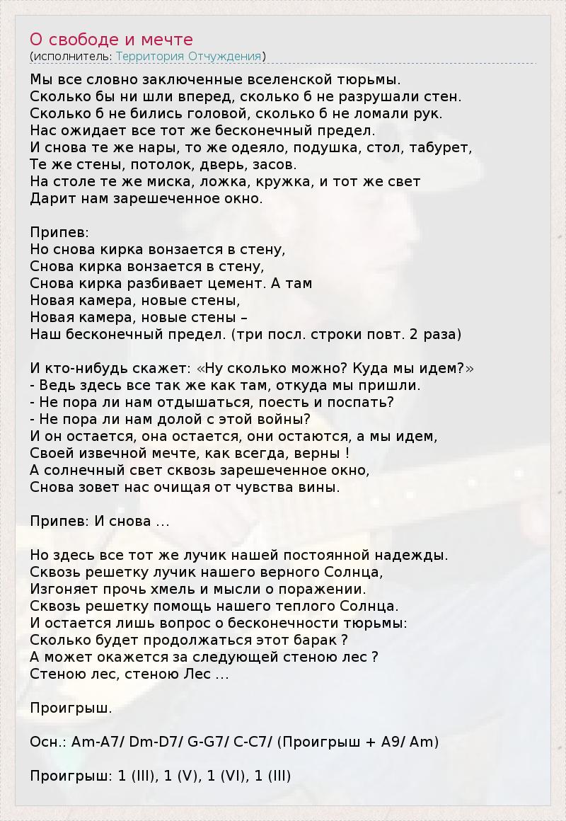 Мы все словно заключенные вселенской тюрьмы. Сколько бы ни шли вперед, сколько б не разрушали стен. Сколько б не бились головой, сколько б не ломали рук. Нас ожидает все тот же бесконечный предел. И снова те же нары, то же одеяло, подушка, стол, табурет, Те же стены, потолок, дверь, засов. На столе те же миска, ложка, кружка, и тот же свет Дарит нам зарешеченное окно. Припев: Но снова кирка вонзается в стену, Снова кирка вонзается в стену, Снова кирка разбивает цемент. А там Новая камера, новые стены, Новая камера, новые стены – Наш бесконечный предел. (три посл. строки повт. 2 раза) И кто-нибудь скажет: «Ну сколько можно? Куда мы идем?» - Ведь здесь все так же как там, откуда мы пришли. - Не пора ли нам отдышаться, поесть и поспать? - Не пора ли нам долой с этой войны? И он остается, она остается, они остаются, а мы идем, Своей извечной мечте, как всегда, верны ! А солнечный свет сквозь зарешеченное окно, Снова зовет нас очищая от чувства вины. Припев: И снова … Но здесь все тот же лучик нашей постоянной надежды. Сквозь решетку лучик нашего верного Солнца, Изгоняет прочь хмель и мысли о поражении. Сквозь решетку помощь нашего теплого Солнца. И остается лишь вопрос о бесконечности тюрьмы: Сколько будет продолжаться этот барак ? А может окажется за следующей стеною лес ? Стеною лес, стеною Лес … Проигрыш. Осн.: Am-A7/ Dm-D7/ G-G7/ C-C7/ (Проигрыш + A9/ Am) Проигрыш: 1 (III), 1 (V), 1 (VI), 1 (III)