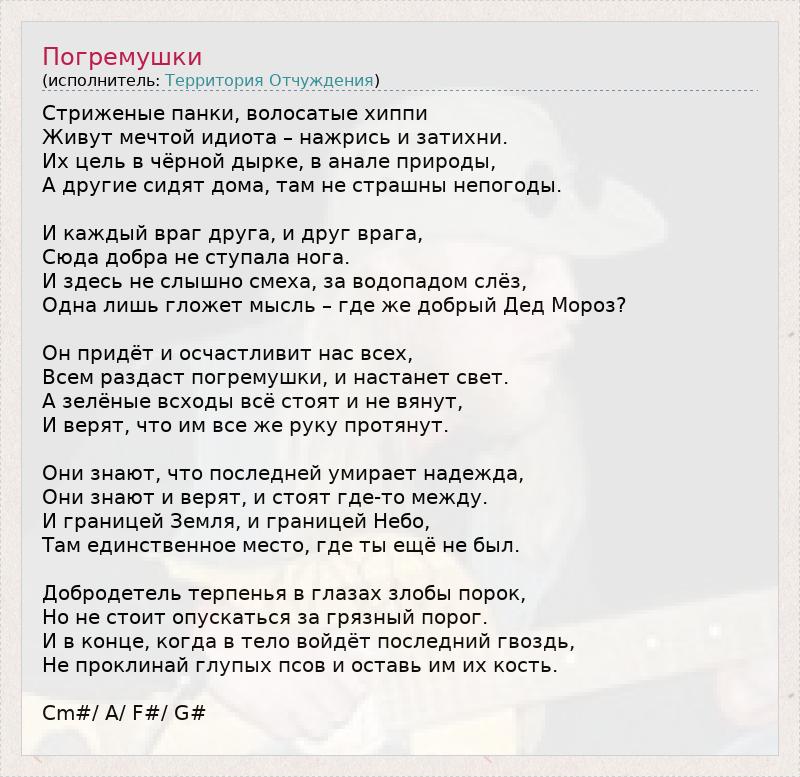 Стриженые панки, волосатые хиппи Живут мечтой идиота – нажрись и затихни. Их цель в чёрной дырке, в анале природы, А другие сидят дома, там не страшны непогоды. И каждый враг друга, и друг врага, Сюда добра не ступала нога. И здесь не слышно смеха, за водопадом слёз, Одна лишь гложет мысль – где же добрый Дед Мороз? Он придёт и осчастливит нас всех, Всем раздаст погремушки, и настанет свет. А зелёные всходы всё стоят и не вянут, И верят, что им все же руку протянут. Они знают, что последней умирает надежда, Они знают и верят, и стоят где-то между. И границей Земля, и границей Небо, Там единственное место, где ты ещё не был. Добродетель терпенья в глазах злобы порок, Но не стоит опускаться за грязный порог. И в конце, когда в тело войдёт последний гвоздь, Не проклинай глупых псов и оставь им их кость. Cm#/ A/ F#/ G#