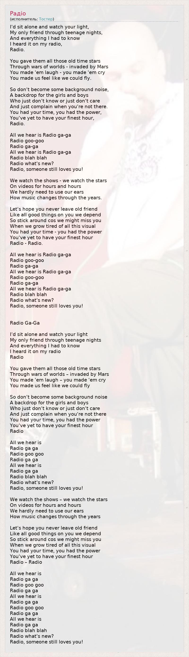 I'd sit alone and watch your light, My only friend through teenage nights, And everything I had to know I heard it on my radio, Radio. You gave them all those old time stars Through wars of worlds - invaded by Mars You made 'em laugh - you made 'em cry You made us feel like we could fly. So don't become some background noise, A backdrop for the girls and boys Who just don't know or just don't care And just complain when you're not there. You had your time, you had the power, You've yet to have your finest hour, Radio. All we hear is Radio ga-ga Radio goo-goo Radio ga-ga All we hear is Radio ga-ga Radio blah blah Radio what's new? Radio, someone still loves you! We watch the shows - we watch the stars On videos for hours and hours We hardly need to use our ears How music changes through the years. Let's hope you never leave old friend Like all good things on you we depend So stick around cos we might miss you When we grow tired of all this visual You had your time - you had the power You've yet to have your finest hour Radio - Radio. All we hear is Radio ga-ga Radio goo-goo Radio ga-ga All we hear is Radio ga-ga Radio goo-goo Radio ga-ga All we hear is Radio ga-ga Radio blah blah Radio what's new? Radio, someone still loves you! Radio Ga-Ga I'd sit alone and watch your light My only friend through teenage nights And everything I had to know I heard it on my radio Radio You gave them all those old time stars Through wars of worlds – invaded by Mars You made 'em laugh – you made 'em cry You made us feel like we could fly So don't become some background noise A backdrop for the girls and boys Who just don't know or just don't care And just complain when you're not there You had your time, you had the power You've yet to have your finest hour Radio All we hear is Radio ga ga Radio goo goo Radio ga ga All we hear is Radio ga ga Radio blah blah Radio what's new? Radio, someone still loves you! We watch the shows – we watch the stars On videos for hours and hours We hardly need to use our ears How music changes through the years Let's hope you never leave old friend Like all good things on you we depend So stick around cos we might miss you When we grow tired of all this visual You had your time, you had the power You've yet to have your finest hour Radio – Radio All we hear is Radio ga ga Radio goo goo Radio ga ga All we hear is Radio ga ga Radio goo goo Radio ga ga All we hear is Radio ga ga Radio blah blah Radio what's new? Radio, someone still loves you!