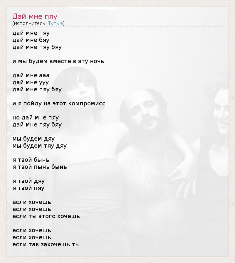 дай мне пяу дай мне бяу дай мне пяу бяу и мы будем вместе в эту ночь дай мне ааа дай мне ууу дай мне пяу бяу и я пойду на этот компромисс но дай мне пяу дай мне пяу бяу мы будем дяу мы будем тяу дяу я твой бынь я твой пынь бынь я твой дяу я твой пяу если хочешь если хочешь если ты этого хочешь если хочешь если хочешь если так захочешь ты