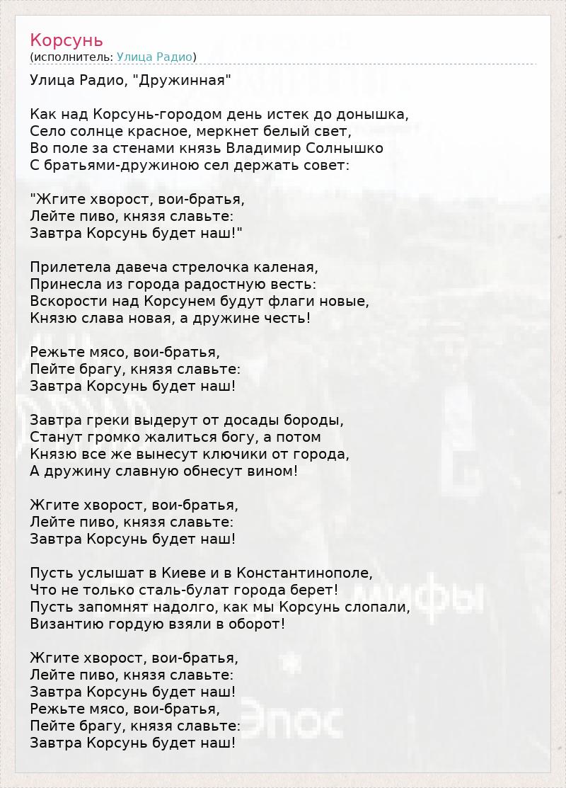 Улица Радио, "Дружинная" Как над Корсунь-городом день истек до донышка, Село солнце красное, меркнет белый свет, Во поле за стенами князь Владимир Солнышко С братьями-дружиною сел держать совет: "Жгите хворост, вои-братья, Лейте пиво, князя славьте: Завтра Корсунь будет наш!" Прилетела давеча стрелочка каленая, Принесла из города радостную весть: Вскорости над Корсунем будут флаги новые, Князю слава новая, а дружине честь! Режьте мясо, вои-братья, Пейте брагу, князя славьте: Завтра Корсунь будет наш! Завтра греки выдерут от досады бороды, Станут громко жалиться богу, а потом Князю все же вынесут ключики от города, А дружину славную обнесут вином! Жгите хворост, вои-братья, Лейте пиво, князя славьте: Завтра Корсунь будет наш! Пусть услышат в Киеве и в Константинополе, Что не только сталь-булат города берет! Пусть запомнят надолго, как мы Корсунь слопали, Византию гордую взяли в оборот! Жгите хворост, вои-братья, Лейте пиво, князя славьте: Завтра Корсунь будет наш! Режьте мясо, вои-братья, Пейте брагу, князя славьте: Завтра Корсунь будет наш!