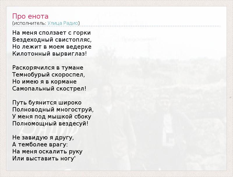 На меня сползает с горки Вездеходный свистопляс, Но лежит в моем ведерке Килотонный вырвиглаз! Раскорячился в тумане Темнобурый скороспел, Но имею я в кормане Самопальный скострел! Путь буянится широко Полноводный многоструй, У меня под мышкой сбоку Полномощный вездесуй! Не завидую я другу, А темболее врагу: На меня оскалить руку Или выставить ногу'