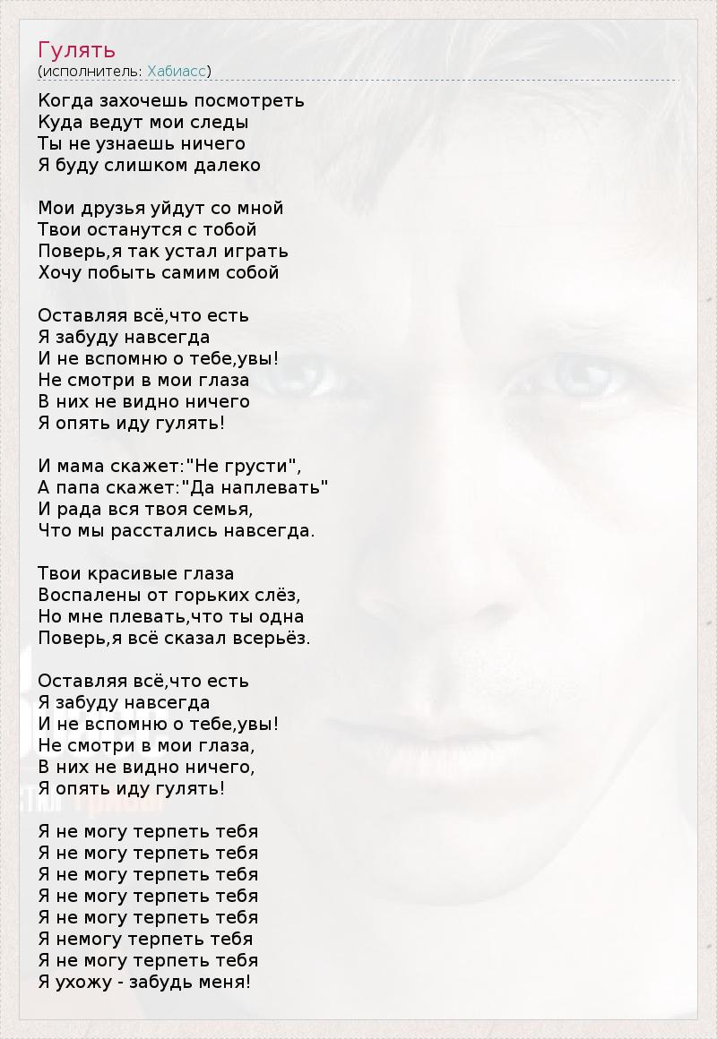 Когда захочешь посмотреть Куда ведут мои следы Ты не узнаешь ничего Я буду слишком далеко Мои друзья уйдут со мной Твои останутся с тобой Поверь,я так устал играть Хочу побыть самим собой Оставляя всё,что есть Я забуду навсегда И не вспомню о тебе,увы! Не смотри в мои глаза В них не видно ничего Я опять иду гулять! И мама скажет:"Не грусти", А папа скажет:"Да наплевать" И рада вся твоя семья, Что мы расстались навсегда. Твои красивые глаза Воспалены от горьких слёз, Но мне плевать,что ты одна Поверь,я всё сказал всерьёз. Оставляя всё,что есть Я забуду навсегда И не вспомню о тебе,увы! Не смотри в мои глаза, В них не видно ничего, Я опять иду гулять! Я не могу терпеть тебя Я не могу терпеть тебя Я не могу терпеть тебя Я не могу терпеть тебя Я не могу терпеть тебя Я немогу терпеть тебя Я не могу терпеть тебя Я ухожу - забудь меня!
