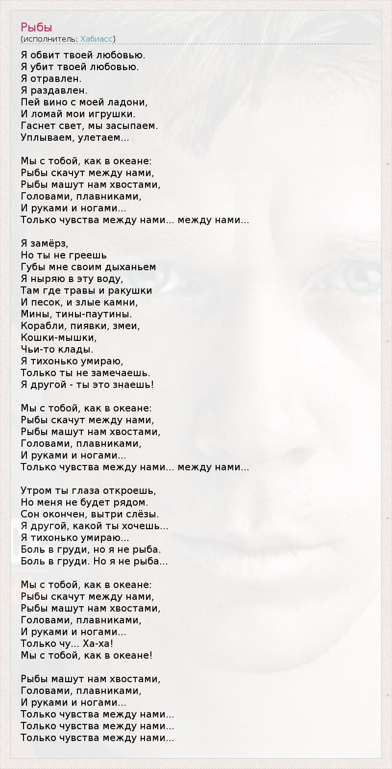 Я обвит твоей любовью. Я убит твоей любовью. Я отравлен. Я раздавлен. Пей вино с моей ладони, И ломай мои игрушки. Гаснет свет, мы засыпаем. Уплываем, улетаем... Мы с тобой, как в океане: Рыбы скачут между нами, Рыбы машут нам хвостами, Головами, плавниками, И руками и ногами... Только чувства между нами... между нами... Я замёрз, Но ты не греешь Губы мне своим дыханьем Я ныряю в эту воду, Там где травы и ракушки И песок, и злые камни, Мины, тины-паутины. Корабли, пиявки, змеи, Кошки-мышки, Чьи-то клады. Я тихонько умираю, Только ты не замечаешь. Я другой - ты это знаешь! Мы с тобой, как в океане: Рыбы скачут между нами, Рыбы машут нам хвостами, Головами, плавниками, И руками и ногами... Только чувства между нами... между нами... Утром ты глаза откроешь, Но меня не будет рядом. Сон окончен, вытри слёзы. Я другой, какой ты хочешь... Я тихонько умираю... Боль в груди, но я не рыба. Боль в груди. Но я не рыба... Мы с тобой, как в океане: Рыбы скачут между нами, Рыбы машут нам хвостами, Головами, плавниками, И руками и ногами... Только чу... Ха-ха! Мы с тобой, как в океане! Рыбы машут нам хвостами, Головами, плавниками, И руками и ногами... Только чувства между нами... Только чувства между нами... Только чувства между нами...