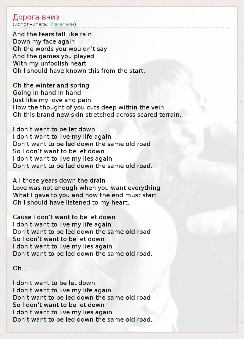 And the tears fall like rain Down my face again Oh the words you wouldn't say And the games you played With my unfoolish heart Oh I should have known this from the start. Oh the winter and spring Going in hand in hand Just like my love and pain How the thought of you cuts deep within the vein Oh this brand new skin stretched across scared terrain. I don't want to be let down I don't want to live my life again Don't want to be led down the same old road So I don't want to be let down I don't want to live my lies again Don't want to be led down the same old road. All those years down the drain Love was not enough when you want everything What I gave to you and now the end must start Oh I should have listened to my heart. Cause I don't want to be let down I don't want to live my life again Don't want to be led down the same old road So I don't want to be let down I don't want to live my lies again Don't want to be led down the same old road. Oh... I don't want to be let down I don't want to live my life again Don't want to be led down the same old road So I don't want to be let down I don't want to live my lies again Don't want to be led down the same old road.