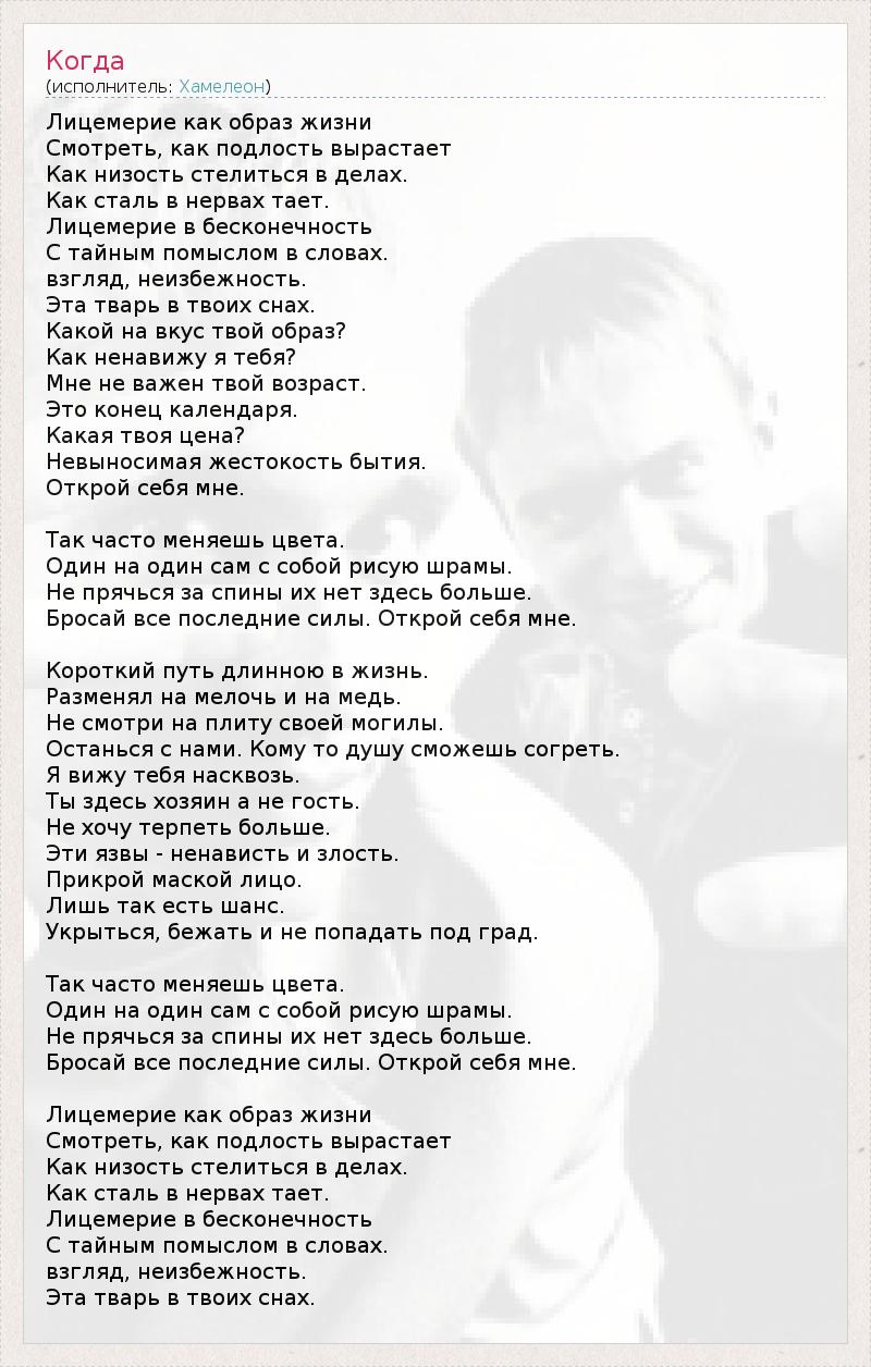 Лицемерие как образ жизни Смотреть, как подлость вырастает Как низость стелиться в делах. Как сталь в нервах тает. Лицемерие в бесконечность С тайным помыслом в словах. взгляд, неизбежность. Эта тварь в твоих снах. Какой на вкус твой образ? Как ненавижу я тебя? Мне не важен твой возраст. Это конец календаря. Какая твоя цена? Невыносимая жестокость бытия. Открой себя мне. Так часто меняешь цвета. Один на один сам с собой рисую шрамы. Не прячься за спины их нет здесь больше. Бросай все последние силы. Открой себя мне. Короткий путь длинною в жизнь. Разменял на мелочь и на медь. Не смотри на плиту своей могилы. Останься с нами. Кому то душу сможешь согреть. Я вижу тебя насквозь. Ты здесь хозяин а не гость. Не хочу терпеть больше. Эти язвы - ненависть и злость. Прикрой маской лицо. Лишь так есть шанс. Укрыться, бежать и не попадать под град. Так часто меняешь цвета. Один на один сам с собой рисую шрамы. Не прячься за спины их нет здесь больше. Бросай все последние силы. Открой себя мне. Лицемерие как образ жизни Смотреть, как подлость вырастает Как низость стелиться в делах. Как сталь в нервах тает. Лицемерие в бесконечность С тайным помыслом в словах. взгляд, неизбежность. Эта тварь в твоих снах.